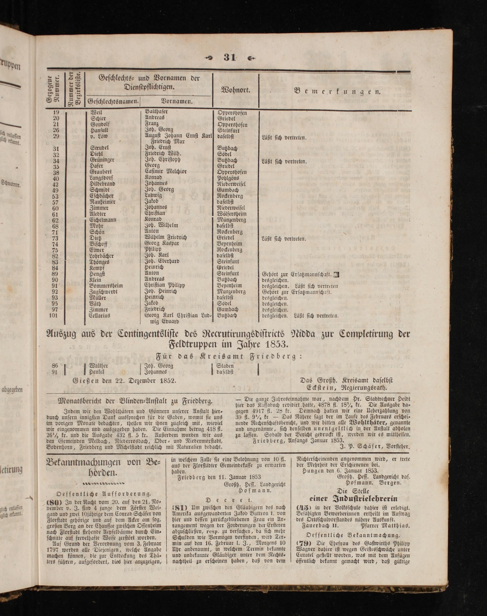 Auszug aus der Contingentsliſte des Recrutirungsdiſtricts Nidda zur Completirung der Feldtruppen im Jahre 1853. Für das Kreisamt Friedberg:
