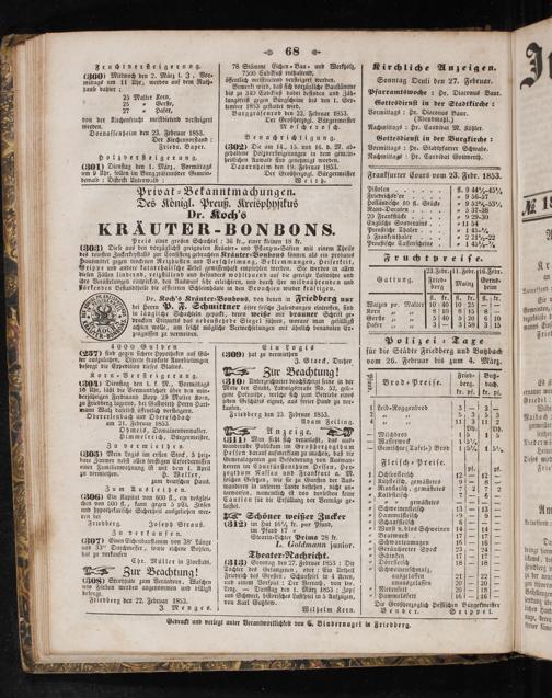 Theater⸗Nachricht. (813) Sonntag den 27. Februar 1853: Die Tochter des Gefangenen, oder: Ein Urtheil Friedrich des Großen, Schauſpiel in 4 Acten, und einem Vorſpiel: Der Verrath, von Dr. Lenz.— Dienftag den 1. März 1853: Zopf und Schwert, hiſtoriſches Luſtſpiel in 5 Aufzügen, von Karl Gutzkow.