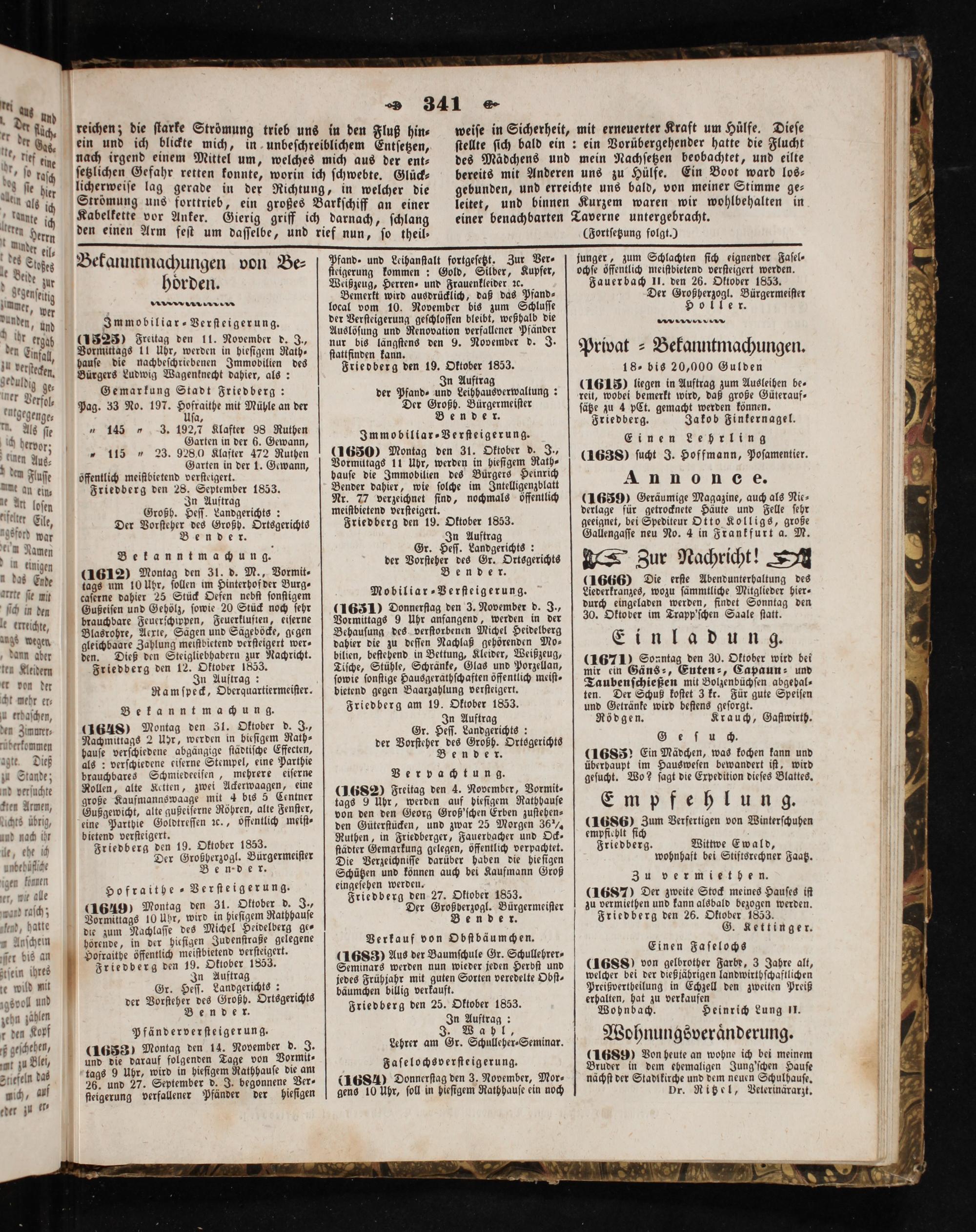 (1630) Montag den 31. Oktober d. J., Vormittags 11 Uhr, werden in hieſigem Rath⸗ hauſe die Immobilien des Bürgers Heinrich Bender dahier, wie ſolche im Intelligenzblatt Nr. 77 verzeichnet ſind, nochmals öffentlich meiftbietend verſteigert. Friedberg den 19. Oktober 1853. In Auftrag Gr. Heſſ. Landgerichts: der Vorſteher des Gr. Ortsgerichts Bender. Mobiliar⸗Verſteigerung. (16310 Donnerſtag den 3. November d. J., Vormittags 9 Uhr anfangend, werden in der Behauſung des verſtorbenen Michel Heidelberg dahier die zu deſſen Nachlaß gehörenden Mo⸗ bilien, beſtehend in Bettung, Kleider, Weißzeug, Tiſche, Stühle, Schränke, Glas und Porzellan, ſowie ſonſtige Hausgeraäthſchaften öffentlich meiſt⸗ bietend gegen Baarzahlung verſteigert. Friedberg am 19. Oktober 1853. In Auftrag Gr. Heſſ. Landgerichts: der Vorſteher des Großh. Ortsgerichts Bender.