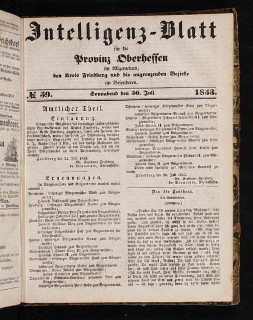 Oſſenheim: ſeitheriger Bürgermeiſter Kopp zum Bürger⸗ meiſter; ſeitheriger Beigeordneter Stumpf zum Beigeordneten. Oſtheim: Beigeordnete Johannes Schneider III. zum Bür⸗ germeiſter; Jakob Winter II. zum Beigeordneten. Staden: ſeitheriger Bürgermeiſter Opper zum Bürgermeiſter; Heinrich Hammel zum Beigeordneten. Wiſſelsheim: Georg Huber zum Beigeordneten. Wölfersheim: ſeitheriger Burgermeiſter Allwohn zum Bür— germeiſter; ſeitheriger Beigeordnete Heinrich Peter Dorſch zum Beigeordneten. Wohnbach: ſeitheriger Bürgermeiſter Philippi II. zum Bür⸗ germeiſter; Conrad Lung II. zum Beigeordneten. Dieſes wird hierdurch zur öffentlichen Kenntniß ge⸗ bracht. Friedberg den 26. Juli 1853. Gr. Kreisamt Friedberg de Beauclair, Kreisaſſeſſor.