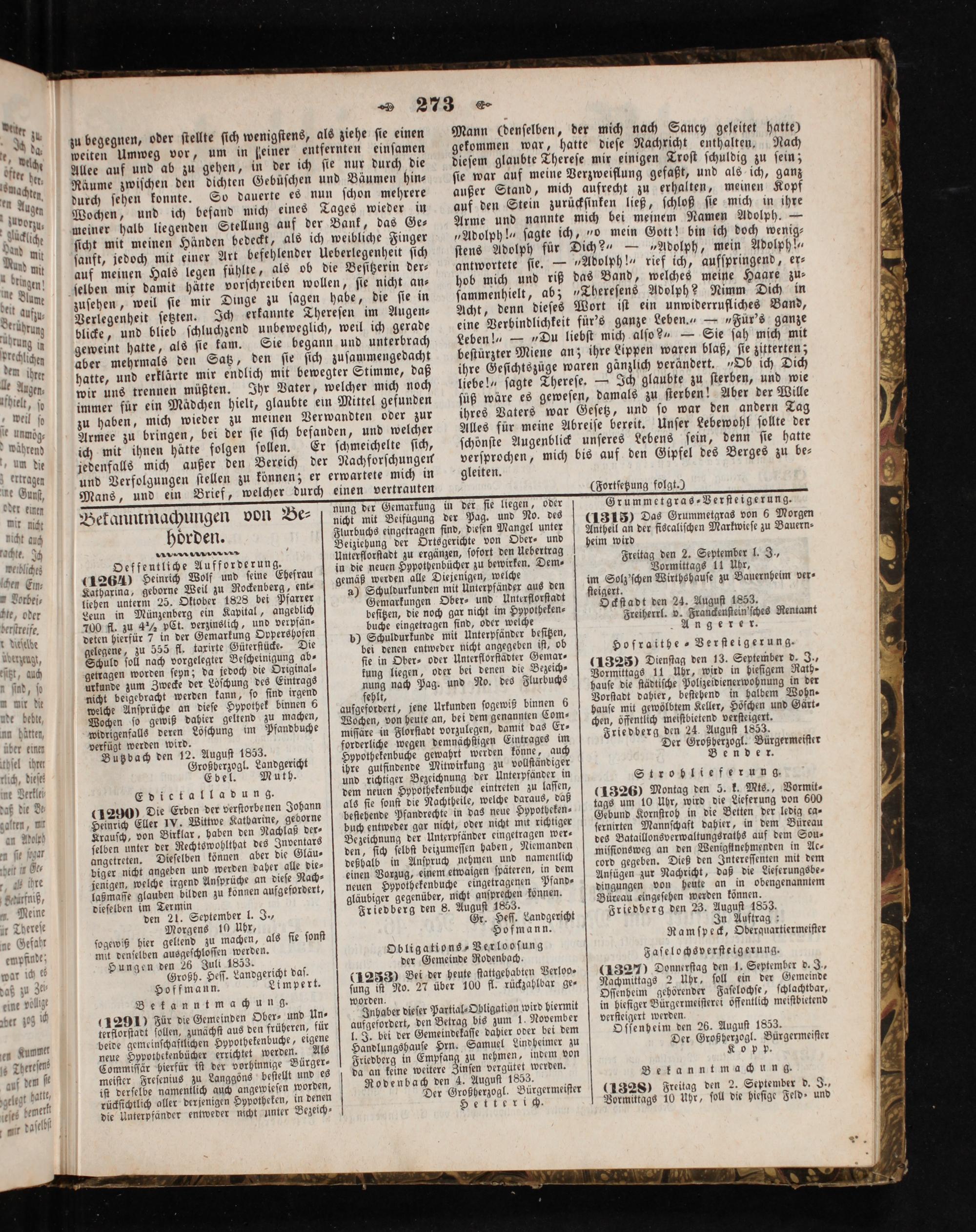 Freitag den 2. September l. J., f Vormittags 11 Uhr, im Solz'ſchen Wirthshauſe zu Bauernheim ver⸗ ſteigert. Ockſtadt den 24. Auguſt 1853. Freiherrl. v. Franckenſtein' ſches Rentamt Angerer.