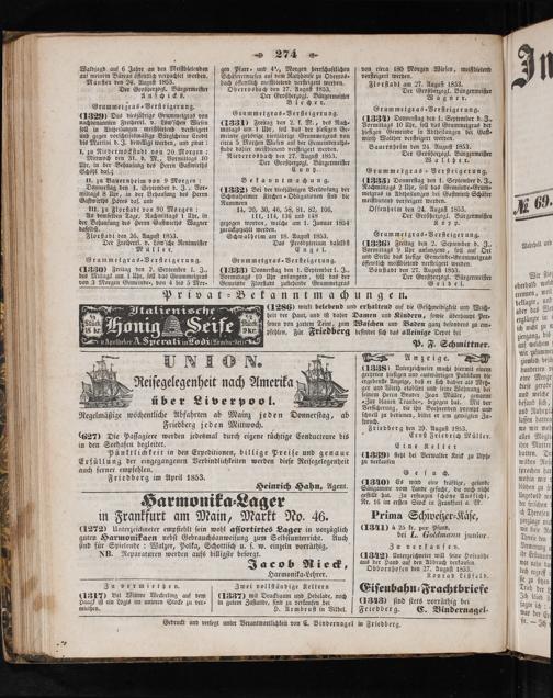 (1332) Bei der diesjährigen Verlooſung der Schwalheimer Kirchen- Obligationen ſind die Nummern 14, 20, 30, 46, 58, 81, 82, 106, 111, 114, 136 und 148 gezogen worden, welche am 1. Januar 1854 zurückgezahlt werden. Schwalheim am 18. Auguſt 1853. Das Presbyterium daſelbſt Engel.