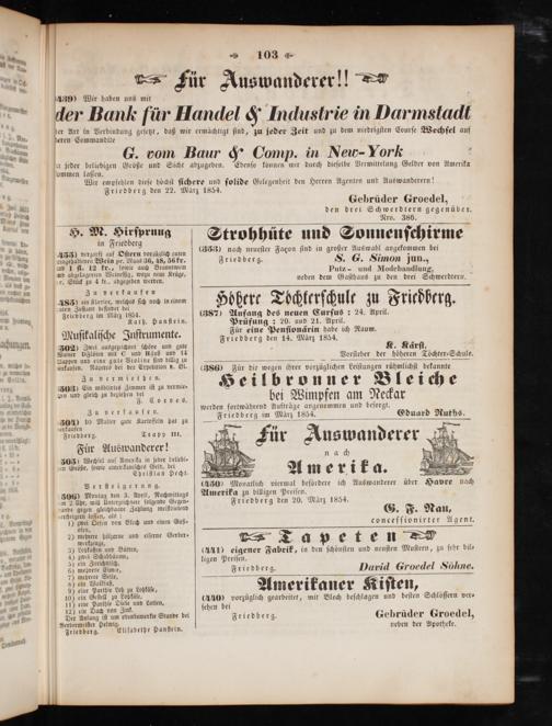 (4300 Monatlich viermal befoͤrdere ich Auswanderer über Havre nach Amerika zu billigen Preiſen. Friedberg den 20. März 1854.