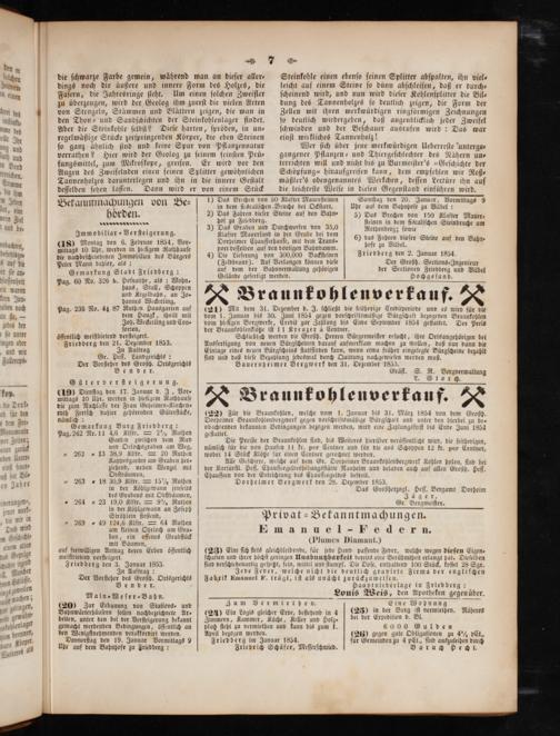vom bieſigen Bergwerke, Credit zur Zahlung bis Ende September 1854 geſtattet. der Braunkoblenklötze iſt 11 Kreuzer à Centner.