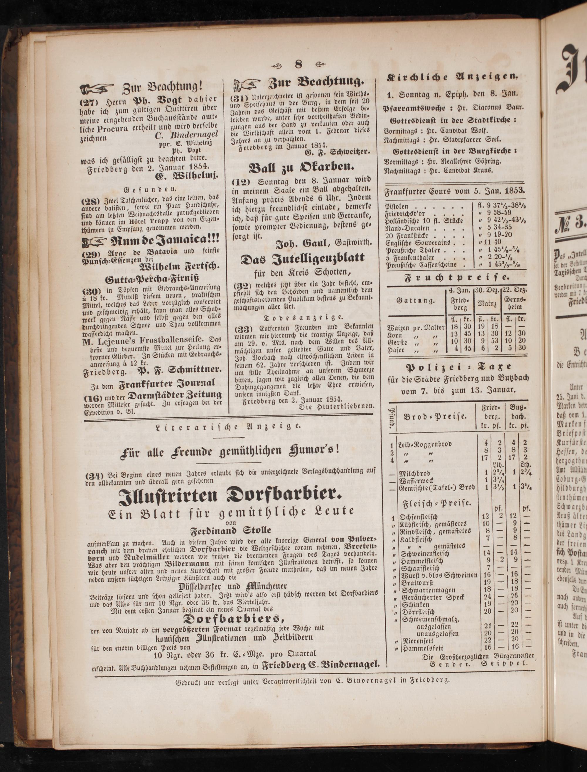 zeichnen C. Bindernagel die Wirtbſchaft allem vom 1. Februar dieſes[Vormittags: Hr. Candidat Wolf pbr. E. Wilhelmz Jahres an zu verpachten. Nach lia 88 S. ph. Vogt Friedberg im Januar, 1854. mittags: Hr. Stadtpfarrer Seel. G