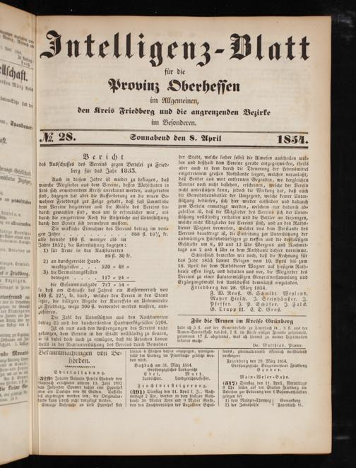 der Stadt, welche lieber ſelbſt die Almoſen austheilen wol— len und deßhalb dem Vereine gerade entgegenwirken, theils aber auch in dem durch die Theuerung der Lebensmittel eingetretenem großen Nothſtande liegen, welcher veranlaßt, daß Bettler aus weit entfernten Gegenden, wo dergleichen Vereine noch nicht beſtehen, erſcheinen, welche der Verein nicht unterſtützen kann, jedoch die Wirkung hat, daß auch die Gewohnheitsbettler der Umgegend, welche keiner Unter— ſtützung bedürfen, ſich hier wieder einfinden und dadurch zum Betteln ermuthigt werden, welchem nur dadurch ab— zuhelfen iſt, daß die Mitglieder des Vereins ſich der Unter— ſtützung vollſtandig enthalten und die Bettler an diejenigen, welche nicht Mitglieder des Vereins ſind, und an den Raths— diener Wagner verweiſen, welcher von dem Vorſtande des Vereins beauftragt iſt, die Einleitung zur Unterſtützung der auswärtigen Hülfsbedürftigen zu treffen und die deßfallſigen Geſchäfte um 8, 10 und 12 Uhr Morgens und Nachmit— tags um 2 und 4 Uhr in dem Rathhauſe dahier vornimmt. Schließlich bemerken wir noch, daß die Rechnung fur das Jahr 1853 ſammt Belegen vom 10. April bis zum 18. April bei dem Rathsdiener Wagner auf hieſigem Rath— hauſe offen liegt, und behalten uns vor, die Mitglieder des Vereins zu einer ſtatutenmaßigen Generalverſammlung und Ergänzungswahl des Ausſchuſſes demnächſt einzuladen. Friedberg den 28. März 1854. F. W. Reuß. G. Schmidt. Weyland. Mayer Hirſch. J. Steinhäußer. J. Pfeffer. J. P. Schäfer. J. Falck. G. Trapp II. C. D. Groß.