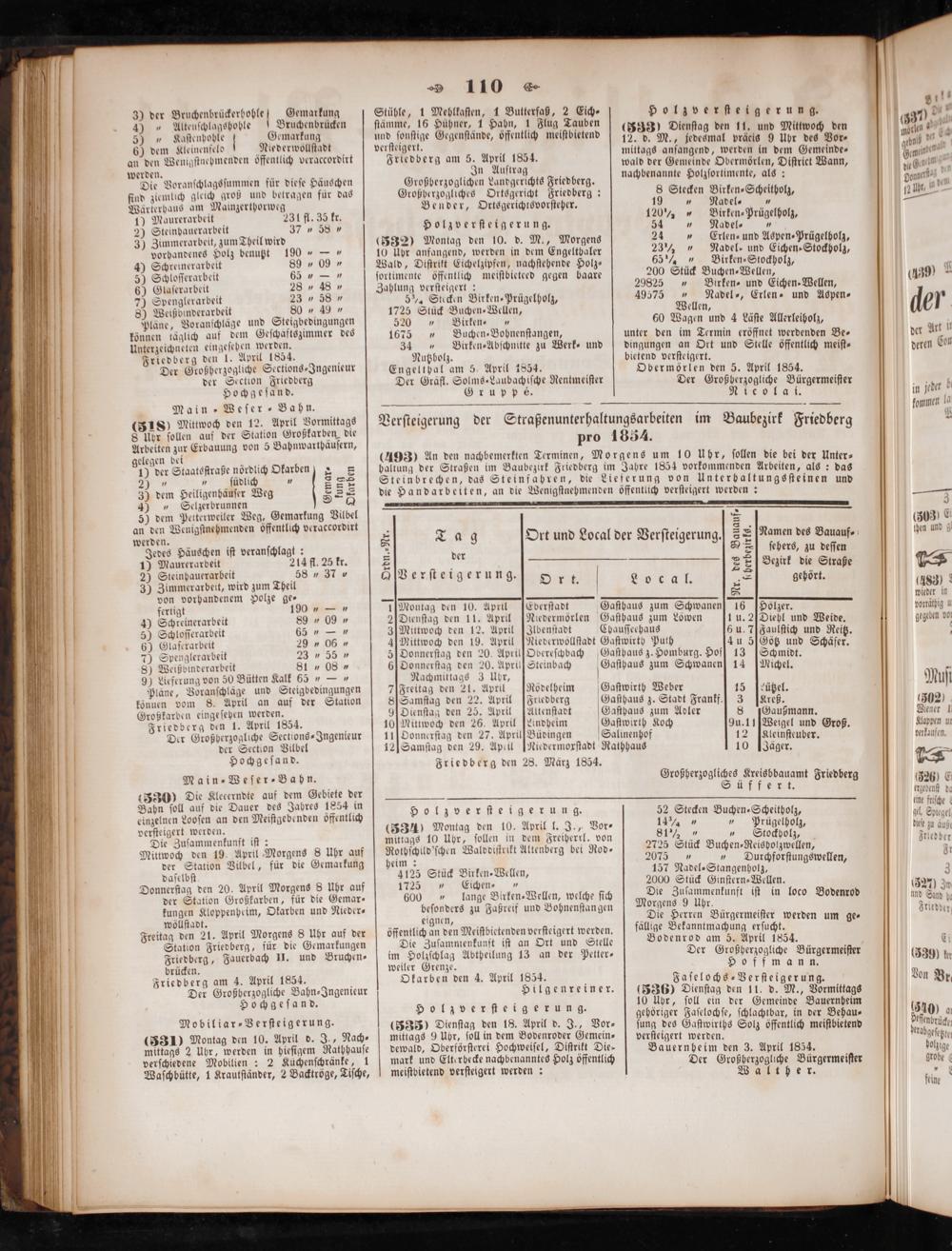 l 8 8 Tag Ort und Local der Verſteigerung. S Namen des Bauauf⸗ 8* 80 S ſehers, zu deſſen 2 i a 2 8 Bezirk die Straße 5* 0 2 4 aö[%uVerſteigerung.] Ort. 4 15 gehört. S 1J[Montag den 10. April[Eberſtadt Gaſthaus zum Schwanenf 16[Holzer. 20Dienſtag den 11. April[Niedermörlen Gaſthaus zum Löwen u. 2[Diehl und Weide. 3] Mitwoch den 12. April Ilbenſtadt Chauſſeehaus 6 u. 71 Faulſtich und Reitz. 4J Mittwoch den 19. April[Niederwollſtadt Gaſtwirth Puth Au 5Götz und Schäfer. 5 Donnerſtag den 20. April Obereſchbach Gaſthaus z. Homburg. Hoff 13[Schmidt. 61 Donnerſtag den 20. April] Steinbach Gaſthaus zum Schwanen] 14[Michel. Nachmittags 3 Uhr, 70Freitag den 21. April[Rödelheim Gaſtwirth Weber 15 eützel. 8 Saͤmſtag den 22. April[Friedberg Gaſthaus z. Stadt Frankf. 3 Kreß. 9 Dienſtag den 25. April IAltenſtadt Gaſthaus zum Adler 8 JGaußmann. 100 Mittwoch den 26. April ſLindheim Gaſtwirth Koch gu. 11J[ Weigel und Groß. 111 Donnerſtag den 27. April[ Büdingen Salinenhof 12 Kleinſteuber. 121 Samſtag den 29. April[Niedermoxſtadt Rathhaus 10 Jäger. Friedberg den 28. März 1854. Großherzogliches Kreisbbauamt Friedberg Seer ez eerſteige ge g. 52 Stecken Buchen⸗Scheitholz, (53) Montag den 10. April l. J., Vor⸗ 1472 5„ Prugelholz, mittags 10 Uhr, ſollen in dem Freiherrl. von.„„ Stockholz,