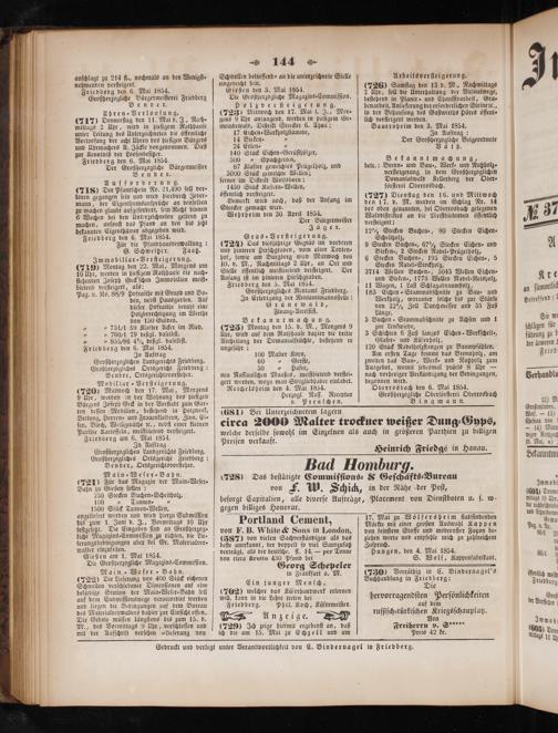 Aufforderung. (718) Der Pfandſchein No. 21,490 ſoll ver⸗ loren gegangen ſein und wird hierdurch Jeder— mann, der Eigenthumsanſprüche an denſelben zu machen glaubt aufgefordert, ſein Recht binnen 6 Wochen bei den Unterzeichneten geltend zu machen, anſonſt das Pfand an den bis jet bekannten Eigenthümer abgegeben wird. Friedberg den 6. Mai 1854. Für die Pfandhausverwaltung: G. Schweitzer. Faatz. Immobiliar-Verſteigerung. (7119) Montag den 22. Mai, Morgens um 10 Uhr, werden in hiefigem Rathhauſe die nach- ſtehenden Joſeph Geck'ſchen Immobilien meiſt— bietend verſteigert, als: f Pag. u. No. 88/9 Hofraithe mit Grund und Bo⸗ den, nebſt Hausgarten. Auf dieſer Hofraithe beruht eine Holzberechtigung im Werthe von 150 Gulden. „„75 1/1 59 Klafter Acker im Ried. „„ 760/1 79 deßgl. daſelbſt. „„ 835/86 4% deßgl. daſelbſt. Friedberg den 6. Mai 1854. In Auftrag Großherzoglichen Landgerichts Friedberg. Großherzogliches Ortsgericht Friedberg: g Bender, Ortsgerichtsvorſteher. Mobiliar-Verſteigerung. (720) Mittwoch den 17. Mai, Morgens 9 Uhr, werden in der Wohnung des hieſigen Bürgers Joſeph Geck in der Vorſtadt zum Gar— ten deſſen Mobilien, beſtehend in Holzwerk, Bettung, Herren- und Frauenkleidern, Zinn, Ei⸗ ſen, Blech, Weißgeräthe ꝛc., nebſt einer kleinen Parthie Kartoffeln, meiſtbietend verſteigert. Friedberg am 6. Mai 1854. In Auftrag Großherzoglichen Landgerichts Friedberg. Großherzogliches Ortsgericht Friedberg: Bender, Ortsgerichtsvorſteher.