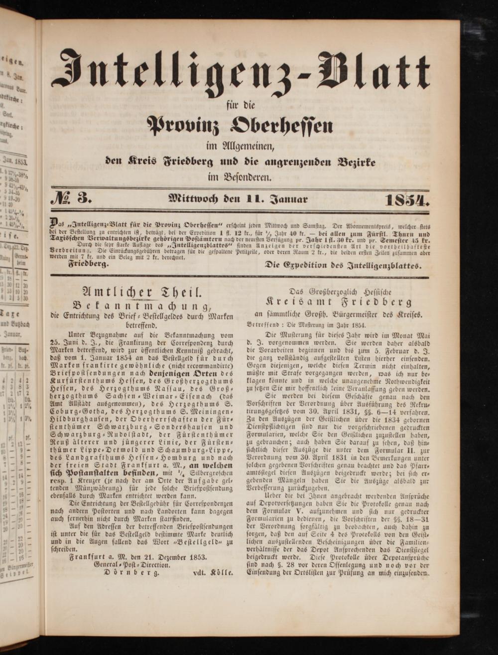D.„Intelligenz⸗Blatt für die Provinz Oberheſſen“ erſcheint jeden Mittwoch und Samſtag. Der Abonnementspret bei der Beſtellung zu entrichten iſt, beträgt, bei der Expedition 1 ee Taxisſchen Verwaltungsbezirke gehörigen Poſtämtern nach der neueſten Verfü