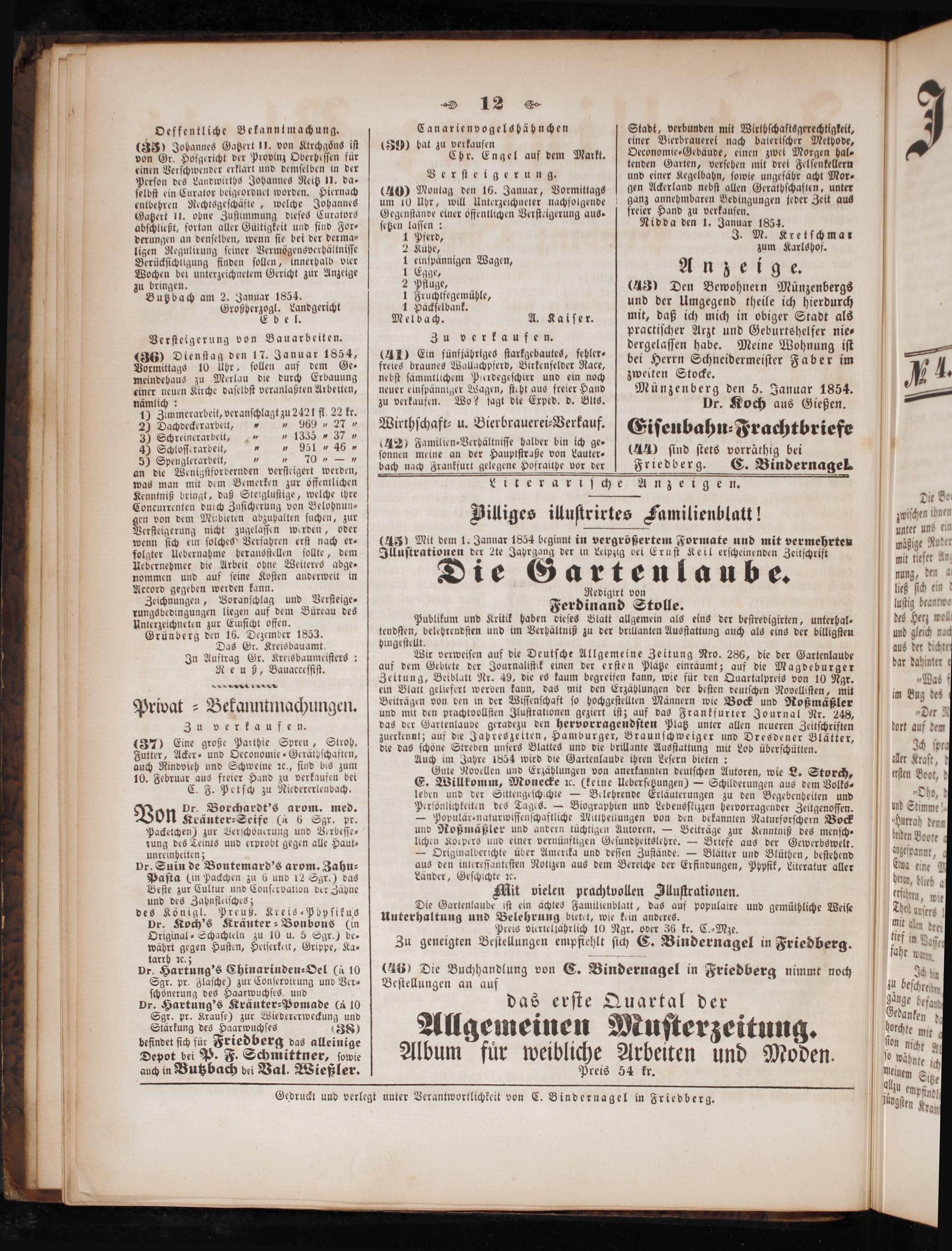 Gedruckt und verlegt unter Verantwortlichkeit von C. Bindernagel in Friedberg.