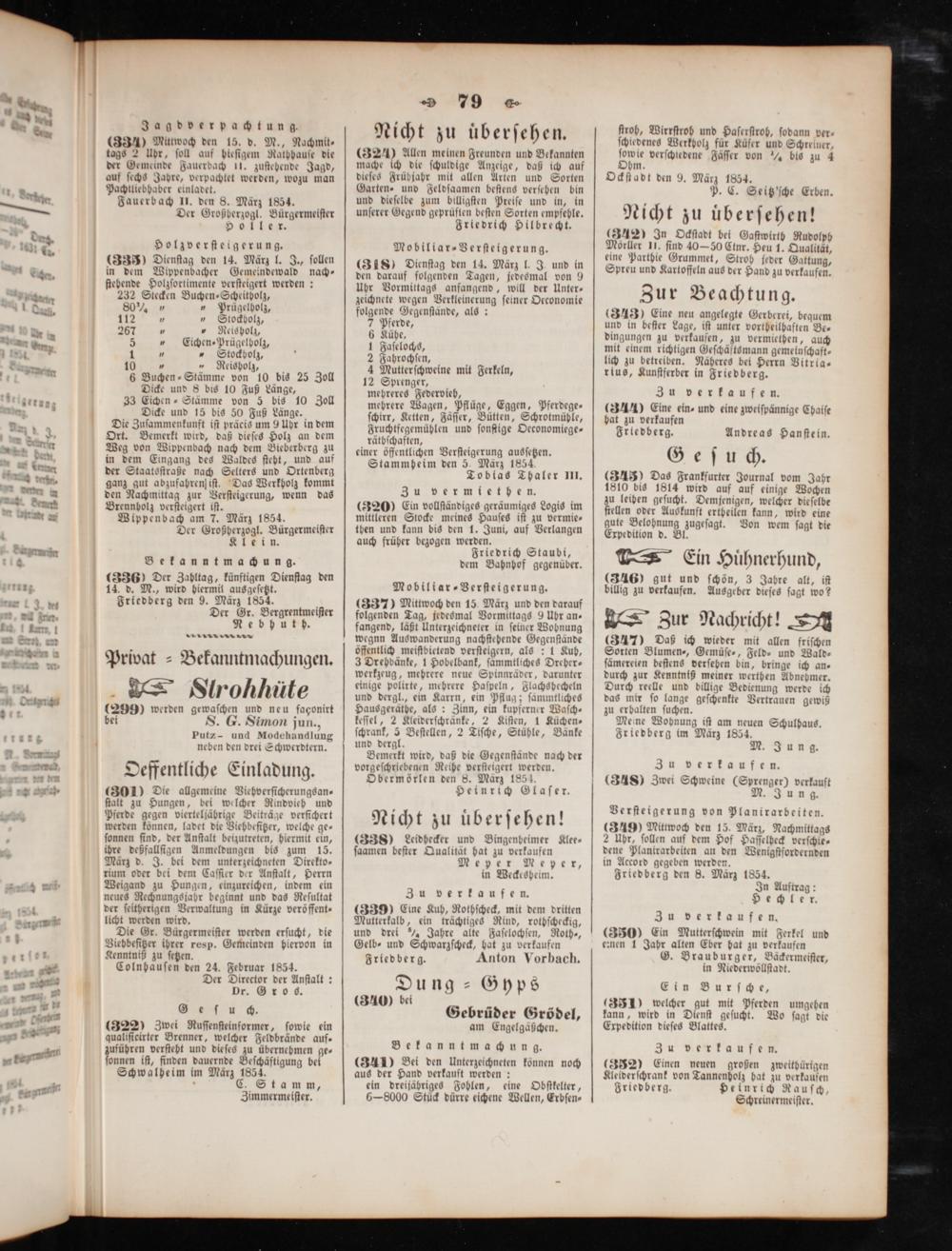 (320) Allen meinen Freunden und Bekannten mache ich die ſchuldige Anzeige, daß ich auf dieſes Frübjahr mit allen Arten und Sorten Garten- und Feldſaamen beſtens verſehen bin und dieſelbe zum billigſten Preiſe und in, in unſerer Gegend geprüften beſten Sorten empfehle. Friedrich Hilbrecht. Mobiliar-Verſteigerung. (318) Dienſtag den 14. März l. J. und in den darauf folgenden Tagen, jedesmal von 9 Uhr Vormittags anfangend, will der Unter— zeichnete wegen Verkleinerung ſeiner Oeconomie folgende Gegenſtände, als: 7 Pferde, Kühe, Faſelochs, Fahrochſen, Mutterſchweine mit Ferkeln, 12 Sprenger, mehreres Federvieh, mehrere Wagen, Pflüge, Eggen, Pferdege— ſchirr, Ketten, Fäſſer, Bütten, Schrotmühle, Fruchtfegemühlen und ſonſtige Oeconomiege— rätbſchaften, einer öffentlichen Verſteigerung ausſetzen. Stammheim den 5. März 1854 Tobias Thaler III. r (320) Ein vollſtändiges geräumiges Logis im mittleren Stocke meines Hauſes iſt zu vermie⸗ then und kann bis den 1. Juni, auf Verlangen auch früher bezogen werden. Friedrich Staubi, dem Bahnhof gegenüber.