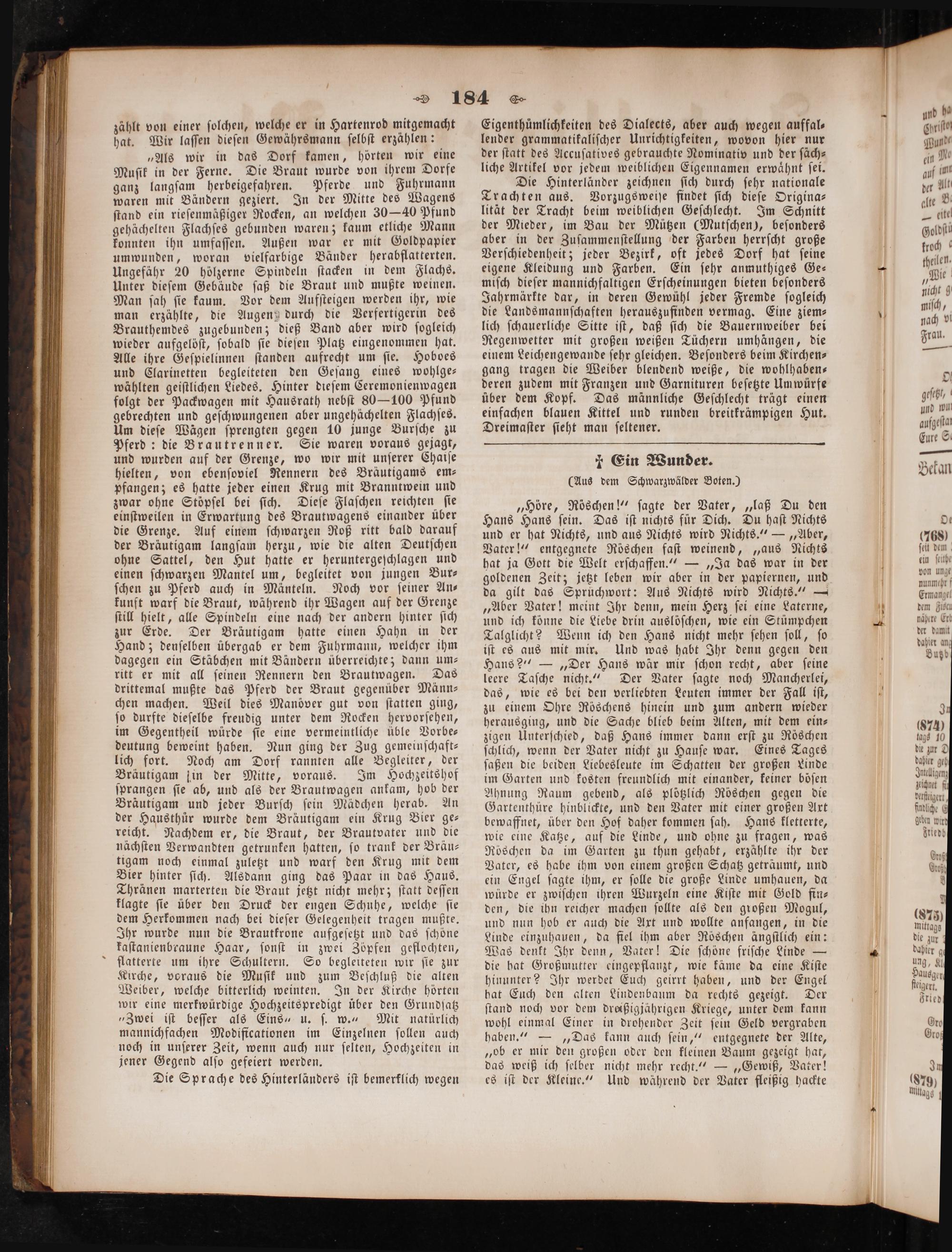 „Als wir in das Dorf kamen, hörten wir eine Muſik in der Ferne. Die Braut wurde von ihrem Dorfe ganz langſam herbeigefahren. Pferde und Fuhrmann waren mit Bändern geziert. In der Mitte des Wagens ſtand ein rieſenmäßiger Rocken, an welchen 3040 Pfund gehächelten Flachſes gebunden waren; kaum etliche Mann konnten ihn umfaſſen. Außen war er mit Goldpapier umwunden, woran vielfarbige Bänder herabflatterten. Ungefähr 20 hölzerne Spindeln ſtacken in dem Flachs. Unter dieſem Gebäude ſaß die Braut und mußte weinen. Man ſah ſie kaum. Vor dem Aufſteigen werden ihr, wie man erzählte, die Augen; durch die Verfertigerin des Brauthemdes zugebunden; dieß Band aber wird ſogleich wieder aufgelöſt, ſobald ſie dieſen Platz eingenommen hat. Alle ihre Geſpielinnen ſtanden aufrecht um ſie. Hobbes und Clarinetten begleiteten den Geſang eines wohlge— wählten geiſtlichen Liedes. Hinter dieſem Ceremonienwagen folgt der Packwagen mit Hausrath nebſt 80—100 Pfund gebrechten und geſchwungenen aber ungehächelten Flachſes. Um dieſe Wägen ſprengten gegen 10 junge Burſche zu Pferd: die Brautrenner. Sie waren voraus gejagt, und wurden auf der Grenze, wo wir mit unſerer Chaiſe hielten, von ebenſoviel Rennern des Bräutigams em— pfangen; es hatte jeder einen Krug mit Branntwein und zwar ohne Stöpſel bei ſich. Dieſe Flaſchen reichten ſie einſtweilen in Erwartung des Brautwagens einander über die Grenze. Auf einem ſchwarzen Roß ritt bald darauf der Bräutigam langſam herzu, wie die alten Deutſchen ohne Sattel, den Hut hatte er heruntergeſchlagen und einen ſchwarzen Mantel um, begleitet von jungen Bur— ſchen zu Pferd auch in Mänteln. Noch vor ſeiner An— kunft warf die Braut, während ihr Wagen auf der Grenze ſtill hielt, alle Spindeln eine nach der andern hinter ſich zur Erde. Der Bräutigam hatte einen Hahn in der Hand; denſelben übergab er dem Fuhrmann, welcher ihm dagegen ein Stäbchen mit Bändern überreichte; dann um— ritt er mit all ſeinen Rennern den Brautwagen. Das drittemal mußte das Pferd der Braut gegenüber Männ— chen machen. Weil dies Manöver gut von ſtatten ging, ſo durfte dieſelbe freudig unter dem Rocken hervorſehen, im Gegentheil würde ſie eine vermeintliche uͤble Vorbe— deutung beweint haben. Nun ging der Zug gemeinſchaft— lich fort. Noch am Dorf rannten alle Begleiter, der Bräutigam hin der Mitte, voraus. Im Hochzeitshof ſprangen ſie ab, und als der Brautwagen ankam, hob der Bräutigam und jeder Burſch ſein Mädchen herab. An der Hausthür wurde dem Bräutigam ein Krug Bier ge— reicht. Nachdem er, die Braut, der Brautvater und die nächſten Verwandten getrunken hatten, ſo trank der Bräu— tigam noch einmal zuletzt und warf den Krug mit dem Bier hinter ſich. Alsdann ging das Paar in das Haus. Thränen marterten die Braut jetzt nicht mehr; ſtatt deſſen klagte ſie über den Druck der engen Schuhe, welche ſie dem Herkommen nach bei dieſer Gelegenheit tragen mußte. Ihr wurde nun die Brautkrone aufgeſetzt und das ſchöne kaſtanienbraune Haar, ſonſt in zwei Zöpfen geflochten, flatterte um ihre Schultern. So begleiteten wir ſie zur Kirche, voraus die Muſik und zum Beſchluß die alten Weiber, welche bitterlich weinten. In der Kirche hörten wir eine merkwürdige Hochzeitspredigt über den Grundſatz „Zwei iſt beſſer als Eins, u. ſ. w.“ Mit natürlich mannichfachen Modificationen im Einzelnen ſollen auch noch in unſerer Zeit, wenn auch nur ſelten, Hochzeiten in jener Gegend alſo gefeiert werden.