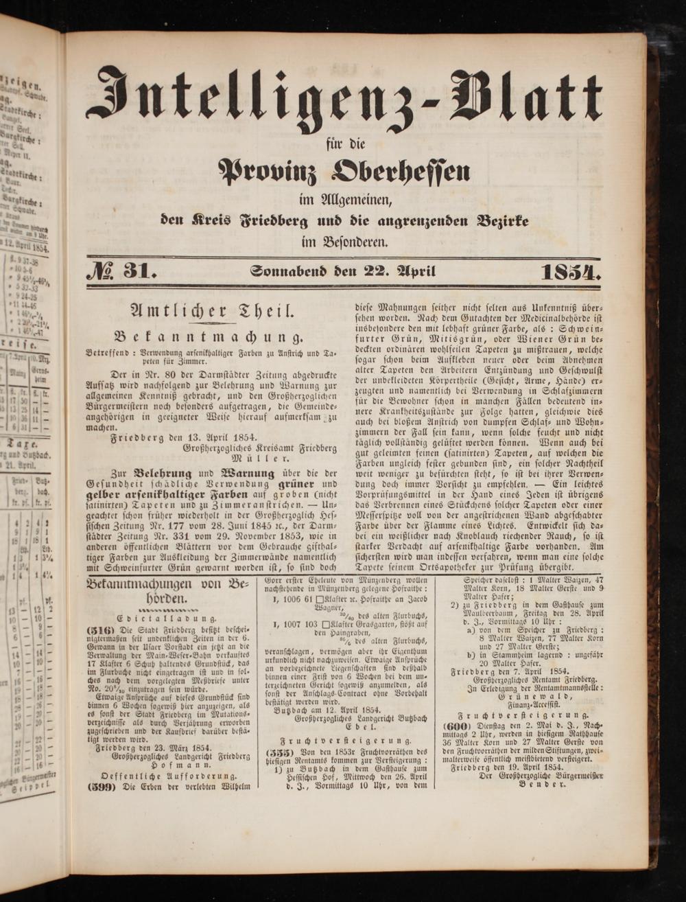 Zur Belehrung und Warnung über die der Geſundheit ſchädliche Verwendung grüner und gelber arſenikhaltiger Farben auf groben(nicht ſatinirten) Tapeten und zu Zimmeranſtrichen.— Un⸗ geachtet ſchon früher wiederholt in der Großherzoglich Heſ— ſiſchen Zeitung Nr. 177 vom 28. Juni 1845 ꝛc., der Darm- ſtäadter Zeitung Nr. 331 vom 29. November 1853, wie in anderen öffentlichen Blättern vor dem Gebrauche gifthal— tiger Farben zur Auskleidung der Zimmerwände namentlich mit Schweinfurter Grün gewarnt worden iſt, ſo ſind doch