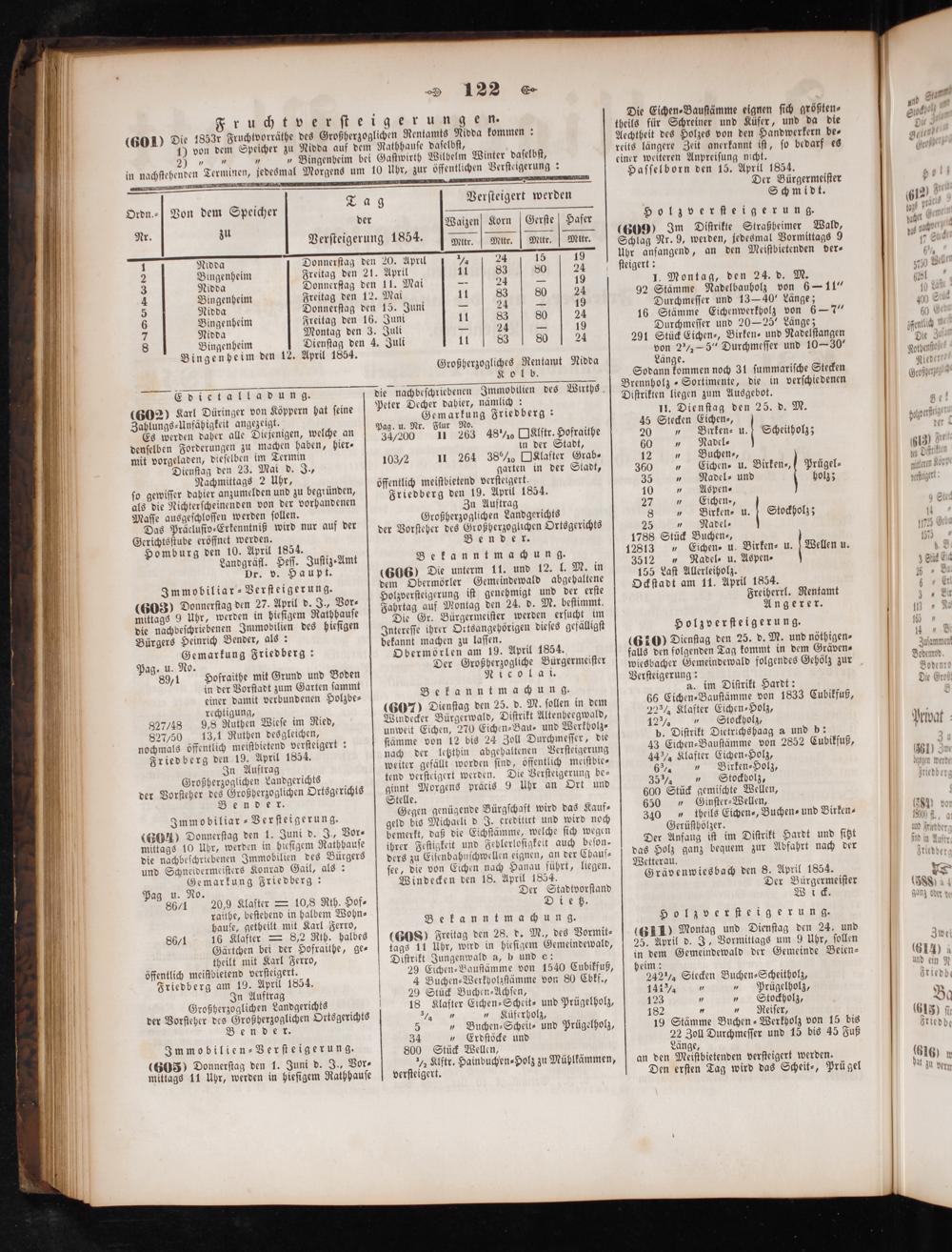 nochmals öffentlich meiſtbietend verſteigert: Friedberg den 19. April 1854. In Auftrag Großherzoglichen Landgerichts der Vorſteher des Großherzoglichen Ortsgerichts Bender.
