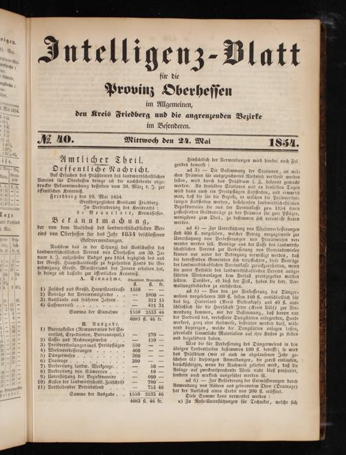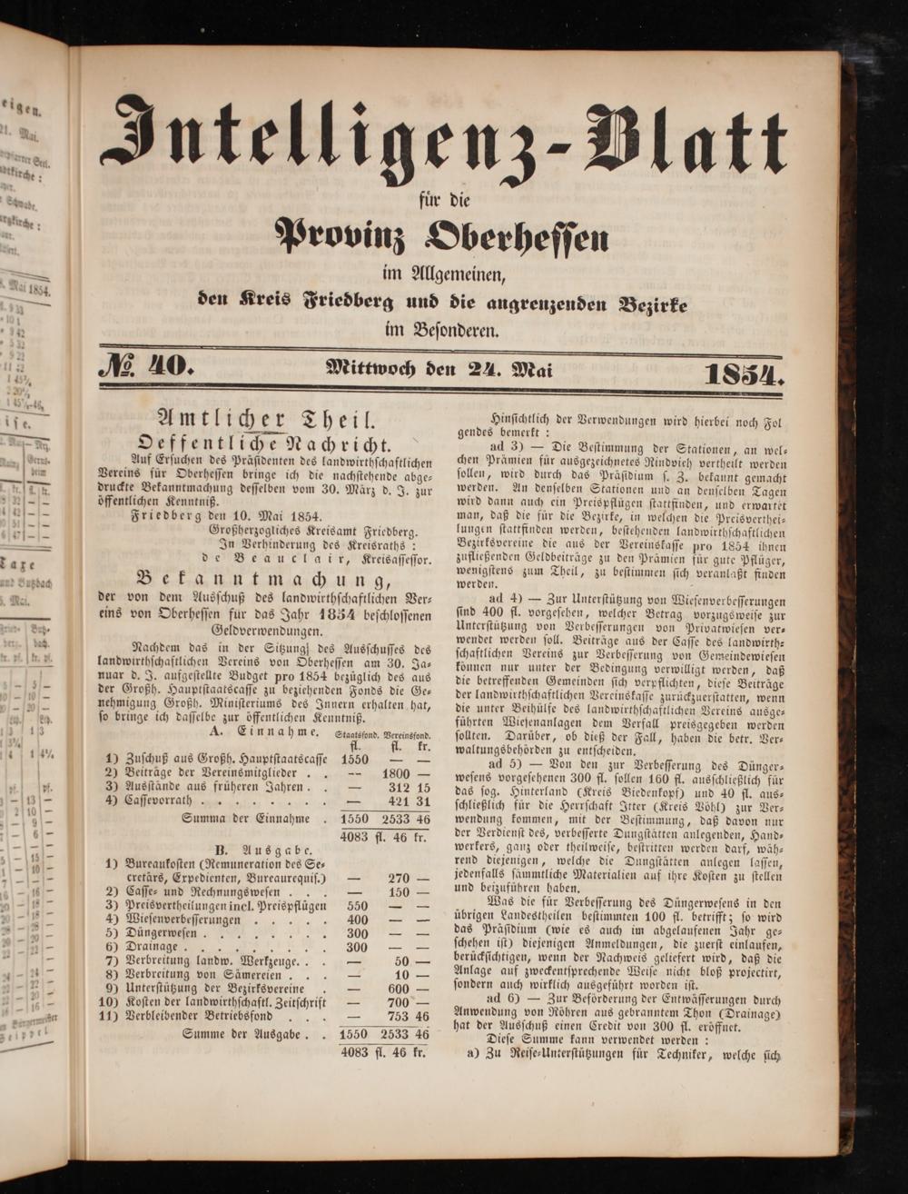Nachdem das in der Sitzungf des Ausſchuſſes des landwirthſchaftlichen Vereins von Oberheſſen am 30. Ja⸗ nuar d. J. aufgeſtellte Budget pro 1854 bezüglich des aus der Großh. Hauptſtaatscaſſe zu beziehenden Fonds die Ge— nehmigung Großh. Miniſteriums des Innern erhalten hat, ſo bringe ich daſſelbe zur öffentlichen Kenntniß.