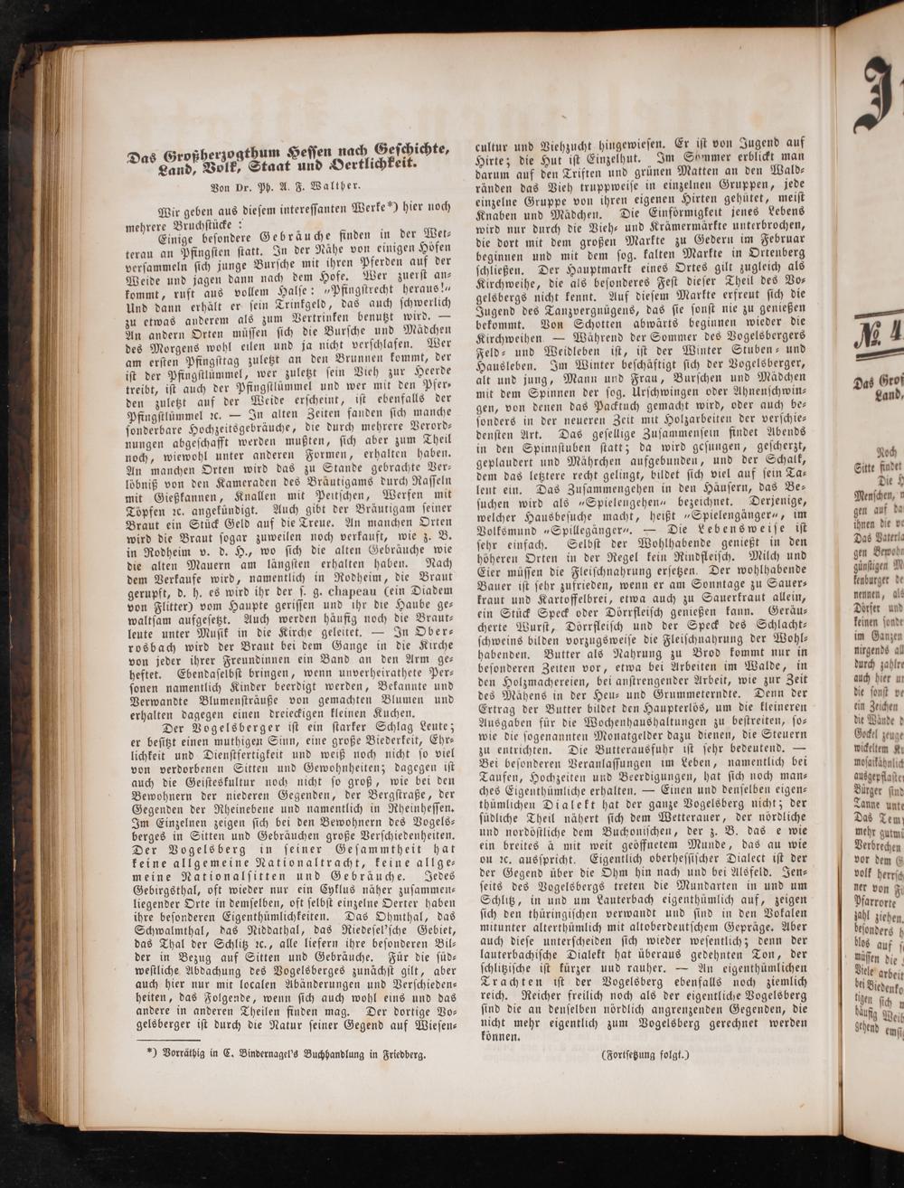 Der Vogelsberger iſt ein ſtarker Schlag Leute; er beſitzt einen muthigen Sinn, eine große Biederkeit, Ehr— lichkeit und Dienſtfertigkeit und weiß noch nicht ſo viel von verdorbenen Sitten und Gewohnheiten; dagegen iſt auch die Geiſteskultur noch nicht ſo groß, wie bei den Bewohnern der niederen Gegenden, der Bergſtraße, der Gegenden der Rheinebene und namentlich in Rheinheſſen. Im Einzelnen zeigen ſich bei den Bewohnern des Vogels— berges in Sitten und Gebräuchen große Verſchiedenheiten. Der Vogelsberg in ſeiner Geſammtheit hat keine allgemeine Nationaltracht, keine allge— meine Nationalſitten und Gebräuche. Jedes Gebirgsthal, oft wieder nur ein Cyklus näher zuſammen— liegender Orte in demſelben, oft ſelbſt einzelne Oerter haben ihre beſonderen Eigenthümlichkeiten. Das Ohmthal, das Schwalmthal, das Niddathal, das Riedeſel'ſche Gebiet, das Thal der Schlitz ꝛc., alle liefern ihre beſonderen Bil— der in Bezug auf Sitten und Gebräuche. Für die ſüd— weſtliche Abdachung des Vogelsberges zunächſt gilt, aber auch hier nur mit localen Abänderungen und Verſchieden— heiten, das Folgende, wenn ſich auch wohl eins und das andere in anderen Theilen finden mag. Der dortige Vo— gelsberger iſt durch die Natur ſeiner Gegend auf Wieſen—