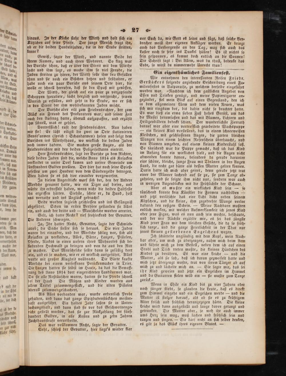 Wir entnehmen den intereſſanten Reiſen Friedr. Gerſtäckers folgende anziehende Beſchreibung eines Fa— milienfeſtes in Valparaiſo, zu welchem derſelbe eingeführt worden war.„Nachdem ich dem gaſtlichen Angebot von Eſſen und Trinken genügt, und meine Papiercigarre an— gezündet, fiel mein Blick auf einen Gegenſtand, den ich in dem allgemeinen Lärm und dem vielen Neuen, was ſich mir ringsum bot, bis dahin nicht ſo beachtet hatte. Es war dieß ein etwa ſieben Fuß hohes Geruſt, um das die Muſici herumſaßen und das mit Blumen, Lichtern und Heiligenbildern bedeckt ſchien. Der wunderlichſte Zierrath darauf war aber eine vortrefflich gearbeitete Wachspuppe — ein kleines Kind vorſtellend, das in einem ſchneeweißen Kleidchen, mit geſchloſſenen Augen, die zarten bleichen Wangen von einem leichten Roſenſchein überhaucht, und von Blumen umgeben, auf einem kleinen Kinderſtuhl ſaß. So täuſchend war die Puppe gemacht, daß ich das Kind im Anfang fur ein wirkliches hielt, und die Augen nicht abwenden konnte davon, beſonders da gerade darunter eine ſchoͤne, bleiche, junge Frau mit Thränen in den Augen ſtand, die recht gut hätte als deſſen Mutter gelten konnen. Darin hatte ich mich aber geirrt, denn gerade jetzt trat einer der Männer lachend auf ſie zu, ſie zum Tanze ab— zuholen, und ſie folgte ihm nicht nur, ſondern war auch in wenigen Augenblicken mit die Fröhlichſte der Schaar.