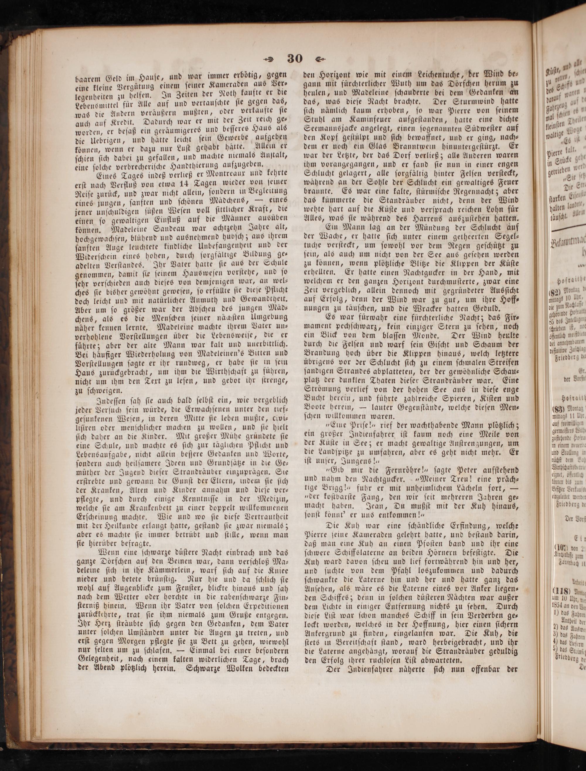 Wenn eine ſchwarze duͤſtere Nacht einbrach und das ganze Dörfchen auf den Beinen war, dann verſchloß Ma— deleine ſich in ihr Kämmerlein, warf ſich auf die Kniee nieder und betete brünſtig. Nur hie und da ſchlich ſie wohl auf Augenblicke zum Fenſter, blickte hinaus und ſah nach dem Wetter oder horchte in die rabenſchwarze Fin⸗ ſterniß hinein. Wenn ihr Vater von ſolchen Expeditionen zurückkehrte, trat ſie ihm niemals zum Gruße entgegen. Ihr Herz ſträubte ſich gegen den Gedanken, dem Vater unter ſolchen Umſtänden unter die Augen zu treten, und erſt gegen Morgen pflegte ſie zu Bett zu gehen, wiewohl nur ſelten um zu ſchlafen.— Einmal bei einer beſondern Gelegenheit, nach einem kalten widerlichen Tage, brach der Abend plötzlich herein. Schwarze Wolken bedeckten