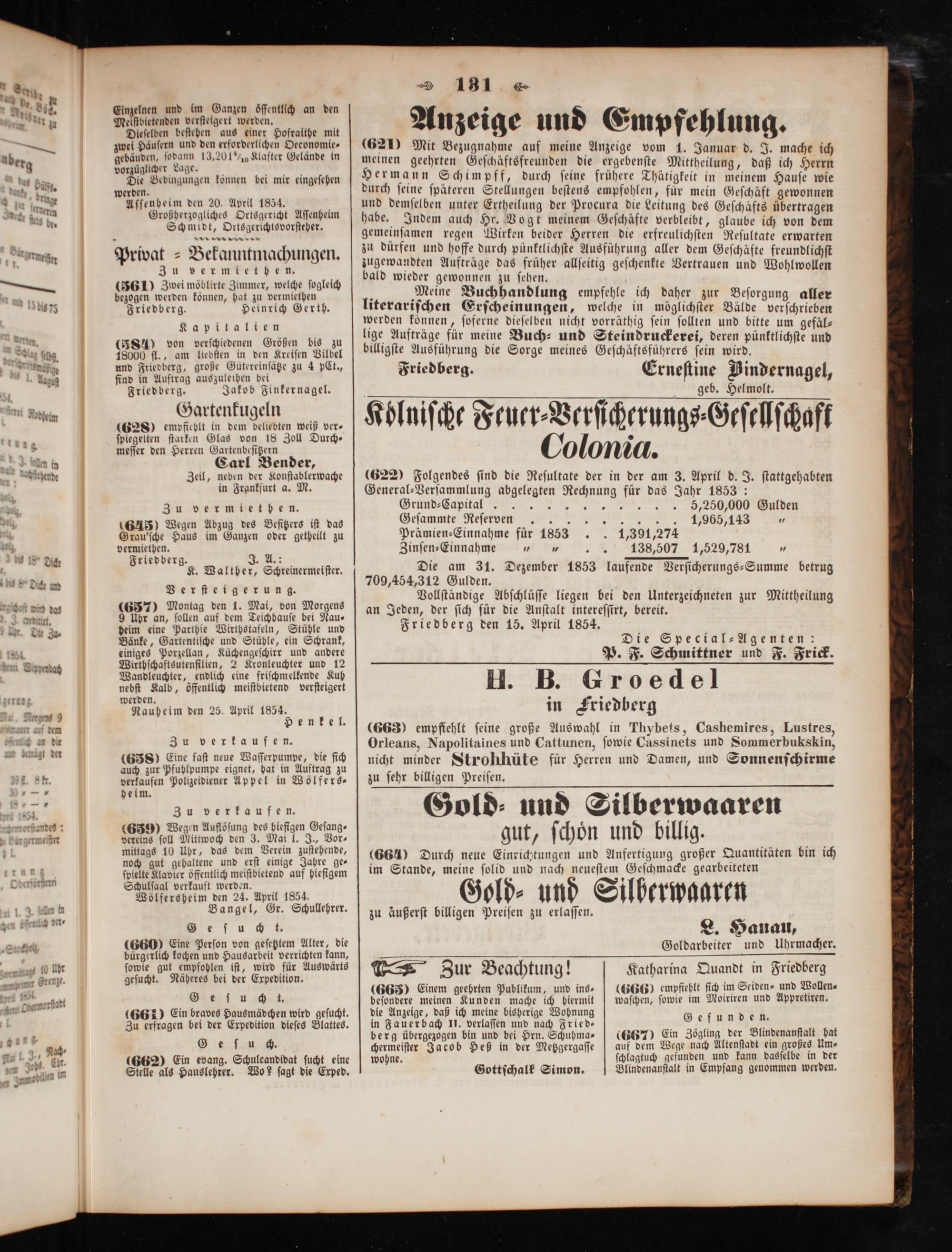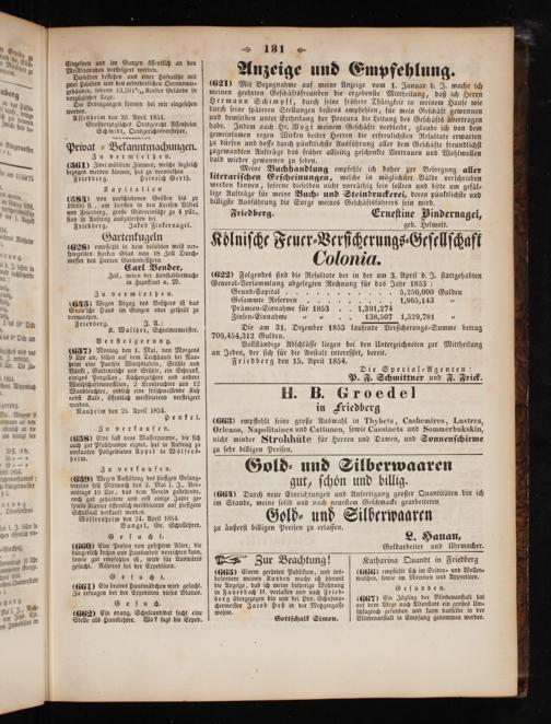* H. B. Groedel in Friedberg (663) empfiehlt ſeine große Auswahl in Thybets, Cashemires, Lustres, Orleans, Napolitaines und Cattunen, ſowie Cassinets und Sommerbukskin, nicht minder Strohhüte für Herren und Damen, und Sonnenſchirme zu ſehr billigen Preiſen.