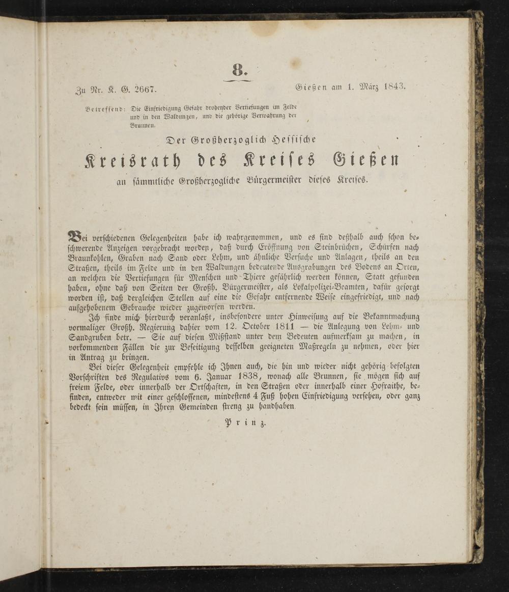 Bei verschiedenen Gelegenheiten habe ich wahrgenommen, und es sind deßhalb auch schon be⸗ schwerende Anzeigen vorgebracht worden, daß durch Eröffnung von Steinbrüchen, Schürfen nach Braunkohlen, Graben nach Sand oder Lehm, und ähnliche Versuche und Anlagen, theils an den Straßen, theils im Felde und in den Waldungen bedeutende Ausgrabungen des Bodens an ien an welchen die Vertiefungen für Menschen und Thiere gefährlich werden können, Statt gefunden haben, ohne daß von Seiten der Großh. Bürgermeister, als Lokalpolizei-Beamten, dafür gesorgt worden ist, daß dergleichen Stellen auf eine die Gefahr entfernende Weise eingefriedigt, und nach aufgehobenem Gebrauche wieder zugeworfen werden. b. a