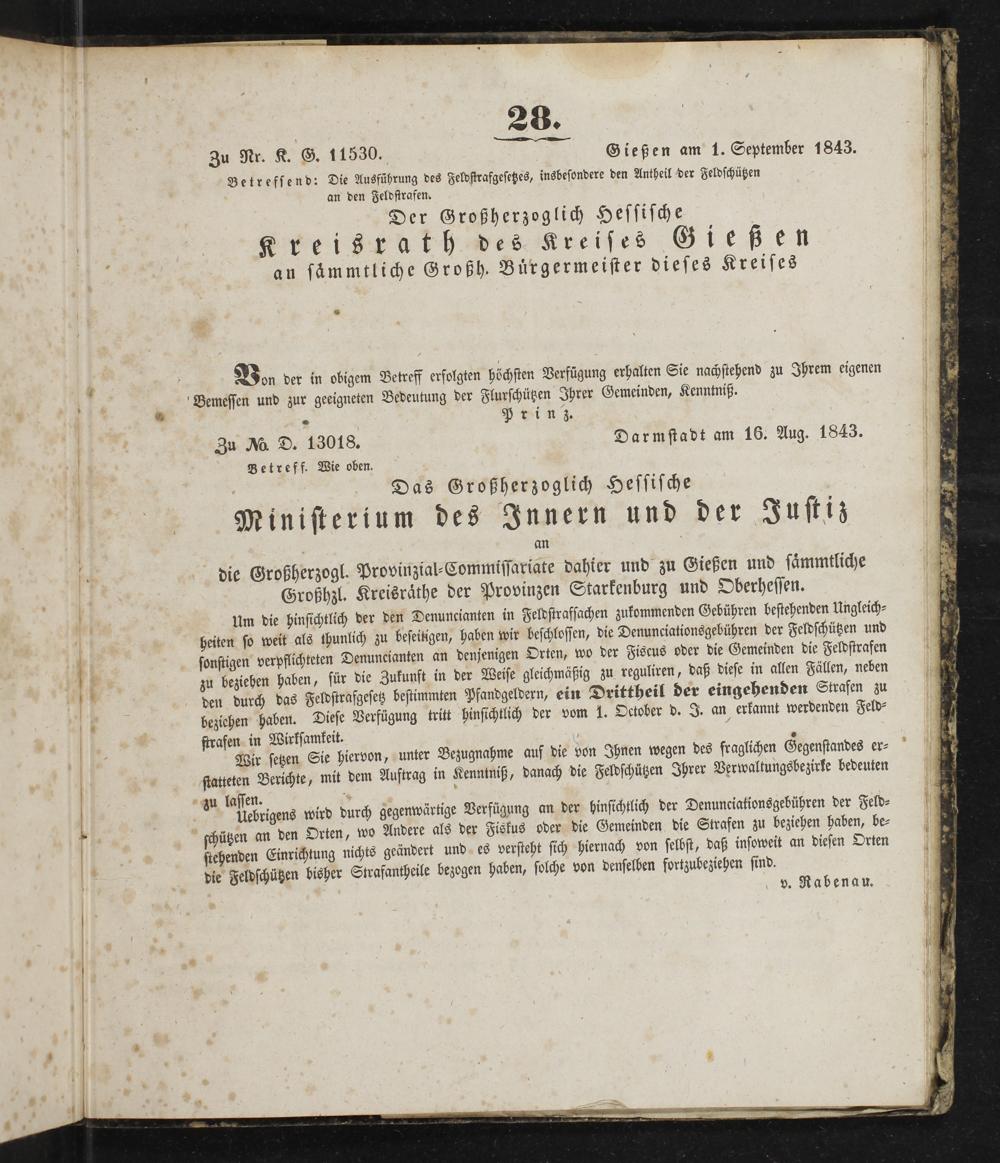 Von der in obigem Betreff erfolgten höchsten Verfügung erhalten Sie nachstehend zu Ihrem eigenen Bemessen und zur geeigneten Bedeutung der Flurschützen Ihrer Gemeinden, Kenntniß. 0 4 Prinz. Zu n D. 13018. Darmstadt am 16. Aug. 1843.
