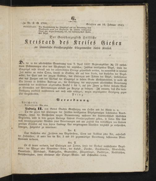 Da die in der allerhöchsten Verordnung vom 7. April 1837 Regierungsblatt A8 23 enthal⸗ tenen Bestimmungen über das Wegfangen der nützlichen, Insekten vertilgenden Vögel, sowie der Singvögel nicht überall mit der erforderlichen Strenge gehandhabt werden, da namentlich in neuerer Zeit wieder an vielen Orten, sowohl in Städten, als auf dem Lande, das Ausheben der Vogel⸗ nester, der Eyer und der jungen Nestbrut, das Einfangen und Toͤdten der Vögel, insbesondere aber das Fangen und der Verkauf der Singvögel in hohem Grade überhandnimmt, so weise ich Sie hiermit in höchstem Auftrage an, die Befolgung der angezogenen allerhöchsten Verordnung namentlich der nachstehend abgedruckten Artikel 1 bis 9, auf jede Ihnen zu Gebot stehende Weise zu überwachen und Uebertretungen alsbald zur Anzeige zu bringen. Ich erwarte, daß Sie dieser Verfügung pünktlich nachkommen und mich nicht nöͤthigen, wegen ungenügender Befolgung gegen Sie vorzuschreiten. Pri n z