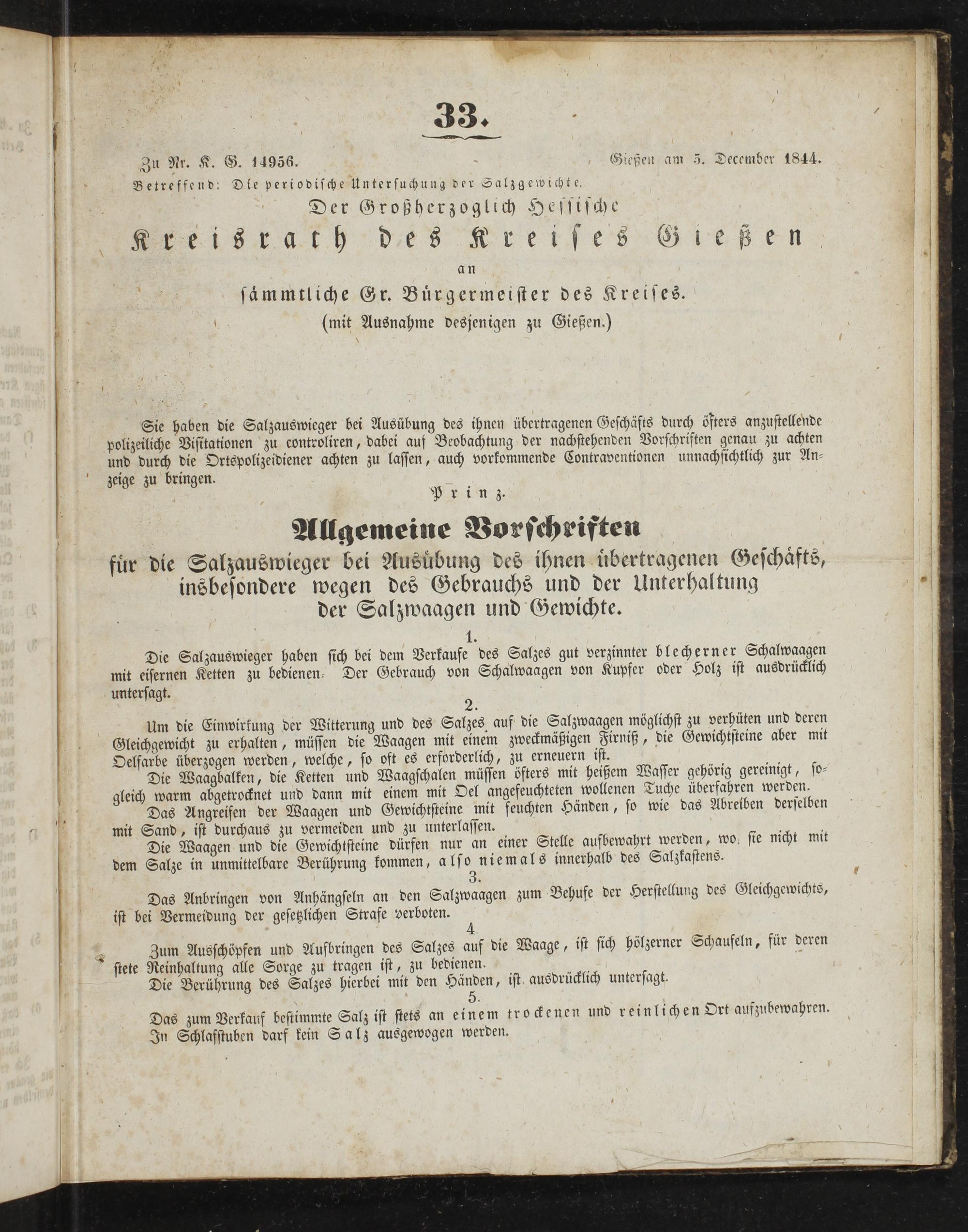 Zu Nr. K. G. 14956. a Gießen am 5. December 1844. Betreffend: Die periodische Untersuchung der Salzgewichte. Der Großherzoglich Hessische ah des Kreises Gießen an saͤmmtliche Gr. Buͤr germeister des Kreises. ö(mit Ausnahme desjenigen zu Gießen.)