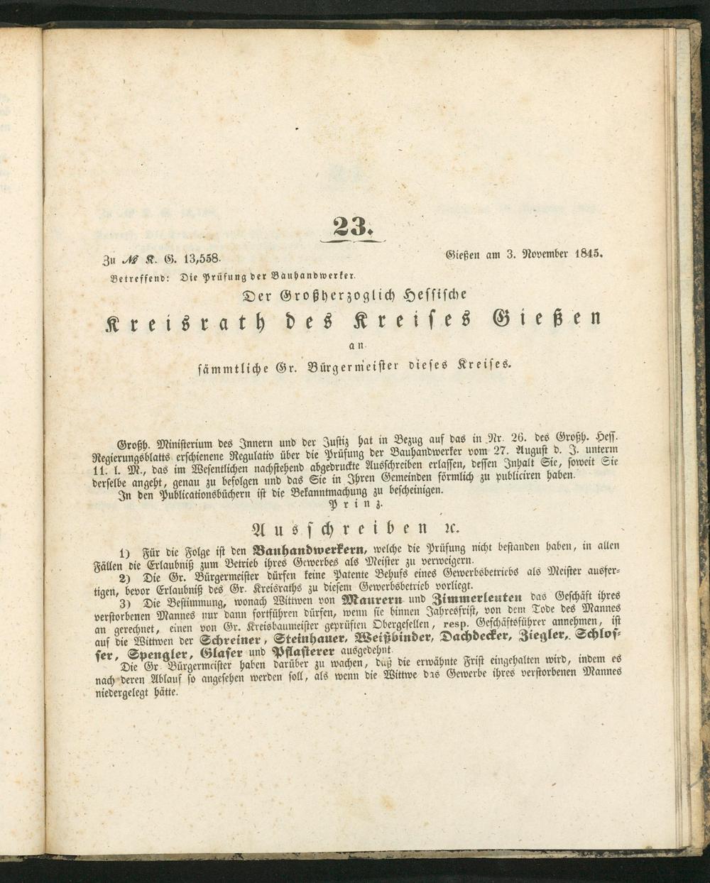 Zu u K. G. 13,558. 5 Gießen am 3. November 1845. Betreffend: Die Prüfung der Bauhandwerker.
