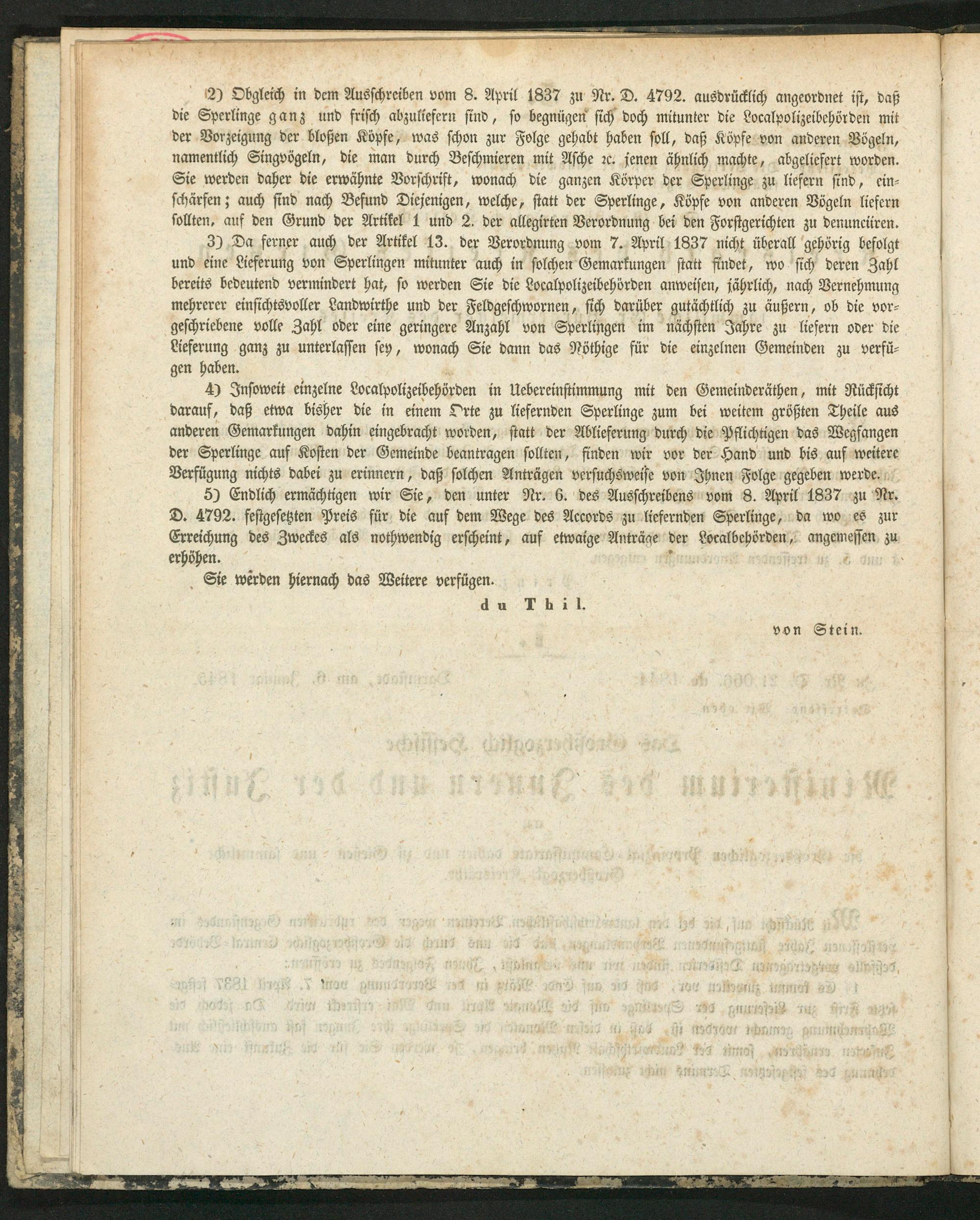 5) Endlich ermächtigen wir Sie, den unter Nr. 6. des Ausschreibens vom 8. April 1837 zu Nr. D. 4792. festgesetzten Preis für die auf dem Wege des Accords zu liefernden Sperlinge, da wo es zur Erreichung des Zweckes als nothwendig erscheint, auf etwaige Anträge der Localbehörden, angemessen zu erhöhen. 5 e 8