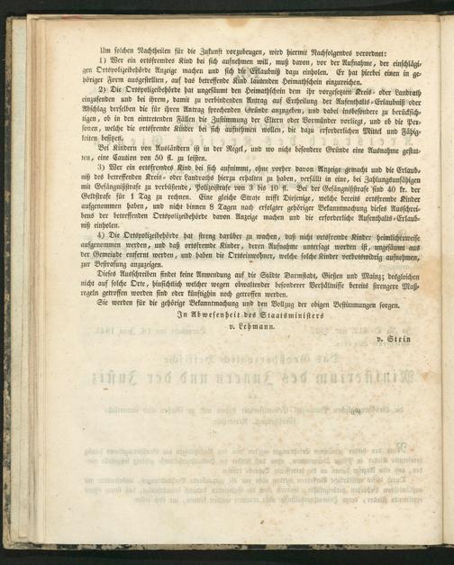 1) Wer ein ortsfremdes Kind bei sich aufnehmen will, muß davon, vor der Aufnahme, der einschlägi⸗ gen Ortspolizeibehörde Anzeige machen und sich die Exlaubniß dazu einholen. Er hat hierbei einen in ge⸗ höriger Form ausgestellten, auf das betreffende Kind lautenden Heimathschein einzureichen.