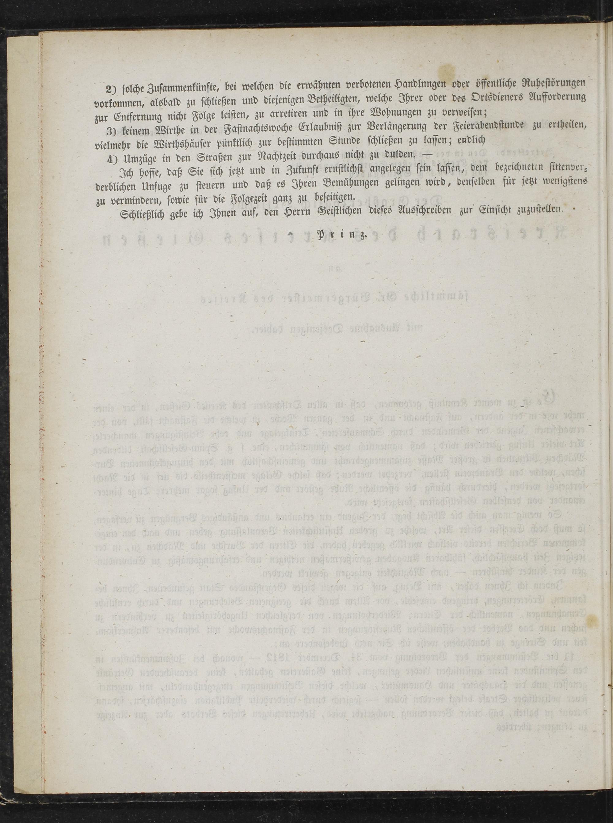 ö 3) keinem Wirthe in der Fastnachtswoche Erlaubniß zur Verlängerung der Feierabendstunde zu ertheilen, N vielmehr die Wirthshäuser pünktlich zur bestimmten Stunde schließen zu lassen; endlich 4) Umzüge in den Straßen zur Nachtzeit durchaus nicht zu dulden.— Ich hoffe, daß Sie sich jetzt und in Zukunft ernstlichst angelegen sein lassen, dem bezeichneten sittenver— derblichen Unfuge zu steuern und daß es Ihren Bemühungen gelingen wird, denselben für jetzt wenigstens 5 zu vermindern, sowie für die Folgezeit ganz zu beseitigen. f Schließlich gebe ich Ihnen auf, den Herrn Geistlichen dieses Ausschreiben zur Einsicht zuzustellen..