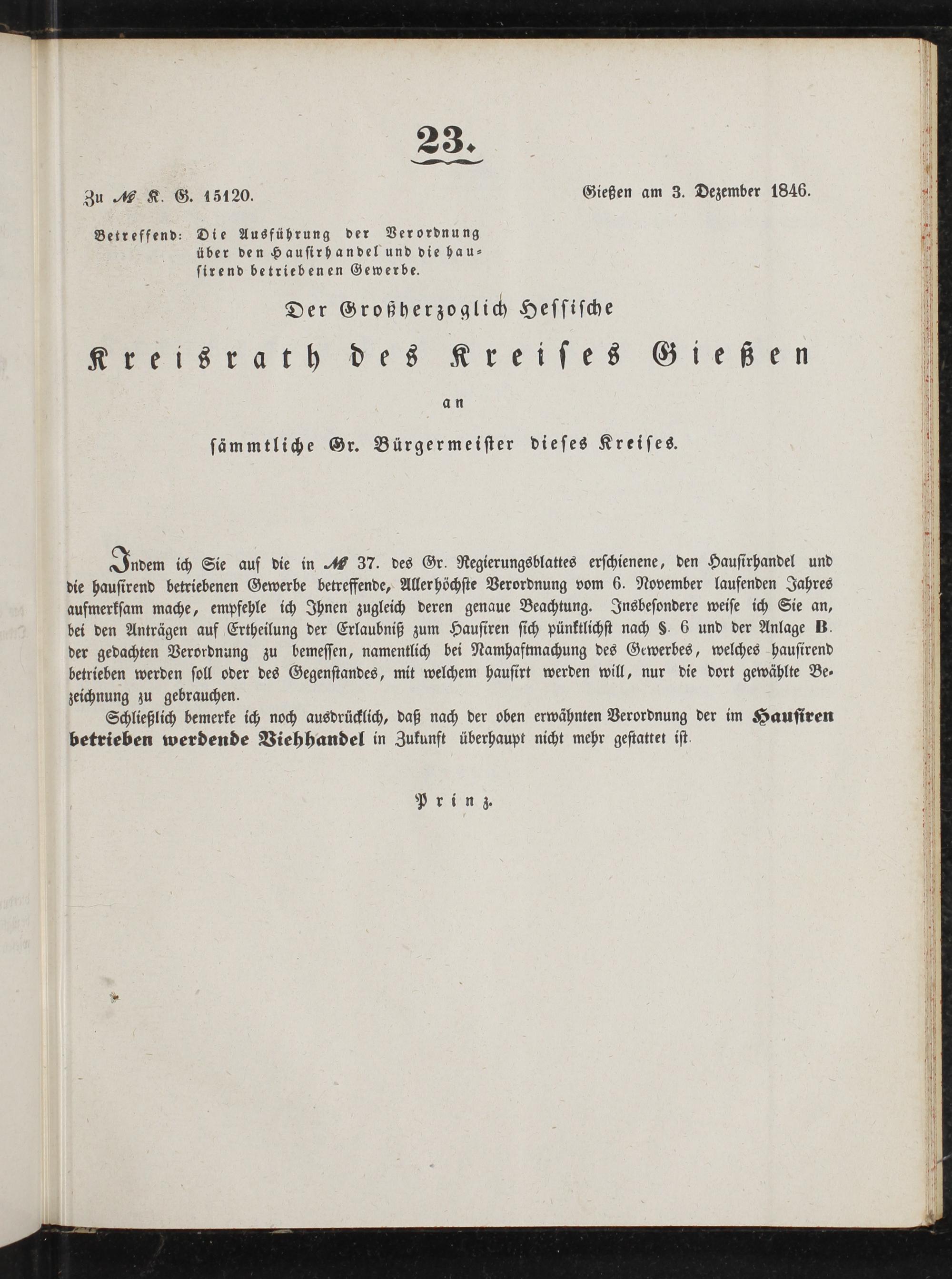 Zu, K. G. 15120. Gießen am 3. Dezember 1846.