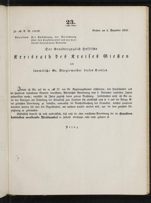Indem ich Sie auf die in 1 37. des Gr. Regierungsblattes erschienene, den Hausirhandel und die hausirend betriebenen Gewerbe betreffende, Aller höchste Verordnung vom 6. November laufenden Jahres aufmerksam mache, empfehle ich Ihnen zugleich deren genaue Beachtung. Insbesondere weise ich Sie an, bei den Anträgen auf Ertheilung der Erlaubniß zum Hausiren sich pünktlichst nach§. 6 und der Anlage B. der gedachten Verordnung zu bemessen, namentlich bei Namhaftmachung des Gewerbes, welches hausirend betrieben werden soll oder des Gegenstandes, mit welchem hausirt werden will, nur die dort gewählte Be⸗ zeichnung zu gebrauchen.