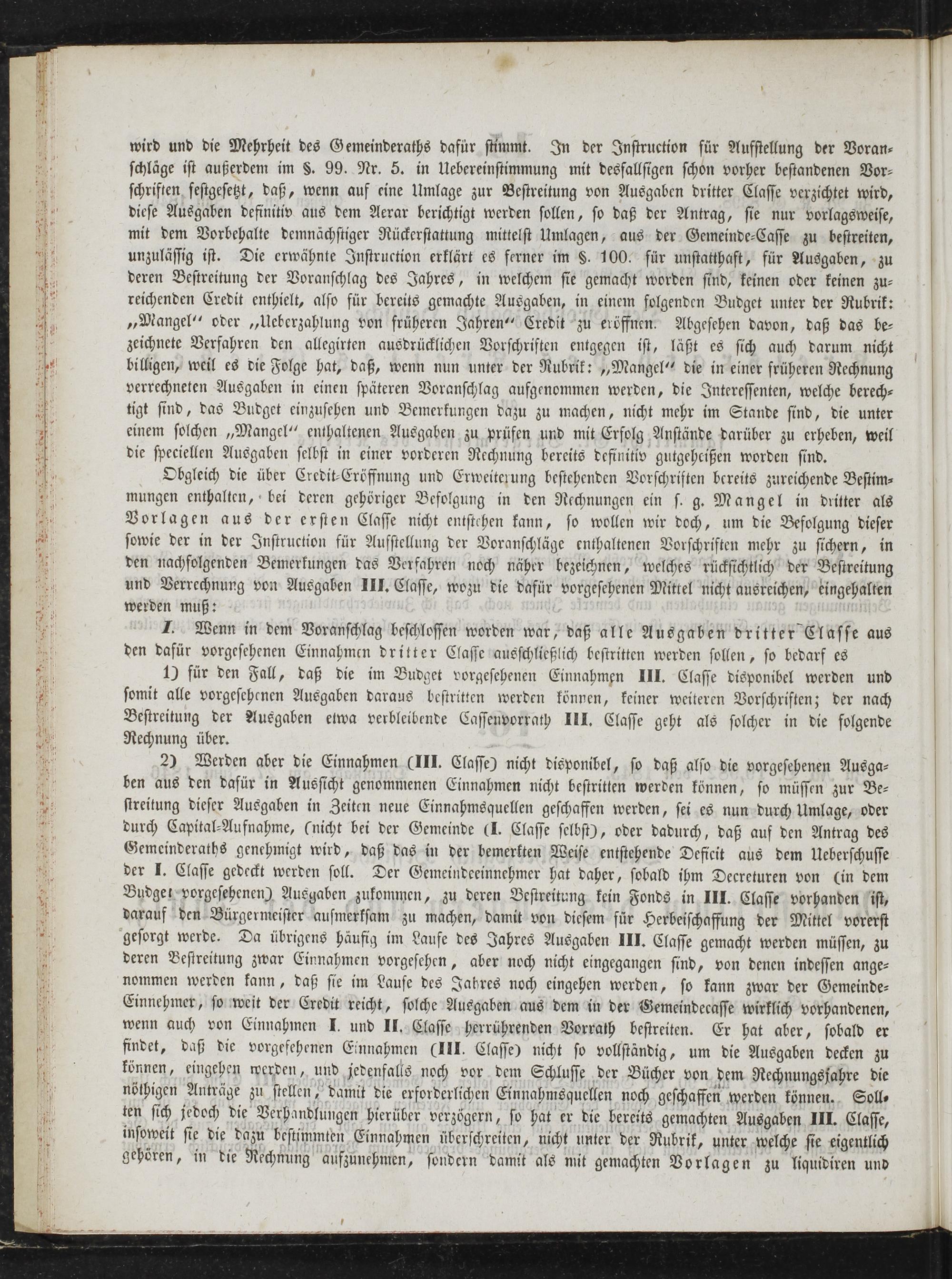 2) Werden aber die Einnahmen(III. Classe) nicht disponibel, so daß also die vorgesehenen Ausga⸗ ben aus den dafür in Aussicht genommenen Einnahmen nicht bestritten werden können, so müssen zur Be⸗ streitung dieser Ausgaben in Zeiten neue Einnahmsquellen geschaffen werden, sei es nun durch Umlage, oder durch Capital⸗Aufnahme,(nicht bei der Gemeinde(I. Classe selbst), oder dadurch, daß auf den Antrag des Gemeinderaths genehmigt wird, daß das in der bemerkten Weise entstehende Deficit aus dem Ueberschusse der I. Classe gedeckt werden soll. Der Gemeindeeinnehmer hat daher, sobald ihm Decreturen von(in dem Budget vorgesehenen) Ausgaben zukommen, zu deren Bestreitung kein Fonds in III. Classe vorhanden ist, darauf den Bürgermeister ausmerksam zu machen, damit von diesem für Herbeischaffung der Mittel vorerst gesorgt werde. Da übrigens häufig im Laufe des Jahres Ausgaben III. Classe gemacht werden müssen, zu deren Bestreitung zwar Einnahmen vorgesehen, aber noch nicht eingegangen sind, von denen indessen ange⸗ nommen werden kann, daß sie im Laufe des Jahres noch eingehen werden, so kann zwar der Gemeinde— Einnehmer, so weit der Credit reicht, solche Ausgaben aus dem in der Gemeindecasse wirklich vorhandenen, wenn auch von Einnahmen IJ. und II. Classe herrührenden Vorrath bestreiten. Er hat aber, sobald er findet, daß die vorgefehenen Einnahmen(III. Classe) nicht so vollständig, um die Ausgaben decken zu können, eingehen werden, und jedenfalls noch vor dem Schlusse der Bücher von dem Rechnungsjahre die nöthigen Anträge zu stellen, damit die erforderlichen Einnahmsquellen noch geschaffen werden können. Soll⸗ ten sich jedoch die Verhandlungen hierüber verzögern, so hat er die bereits gemachten Ausgaben III. Classe, insoweit sie die dazu bestimmten Einnahmen überschreiten, nicht unter der Rubrik, unter welche sie eigentlich gehören, in die Rechnung aufzunehmen, sondern damit als mit gemachten Vorlagen zu liquidiren und