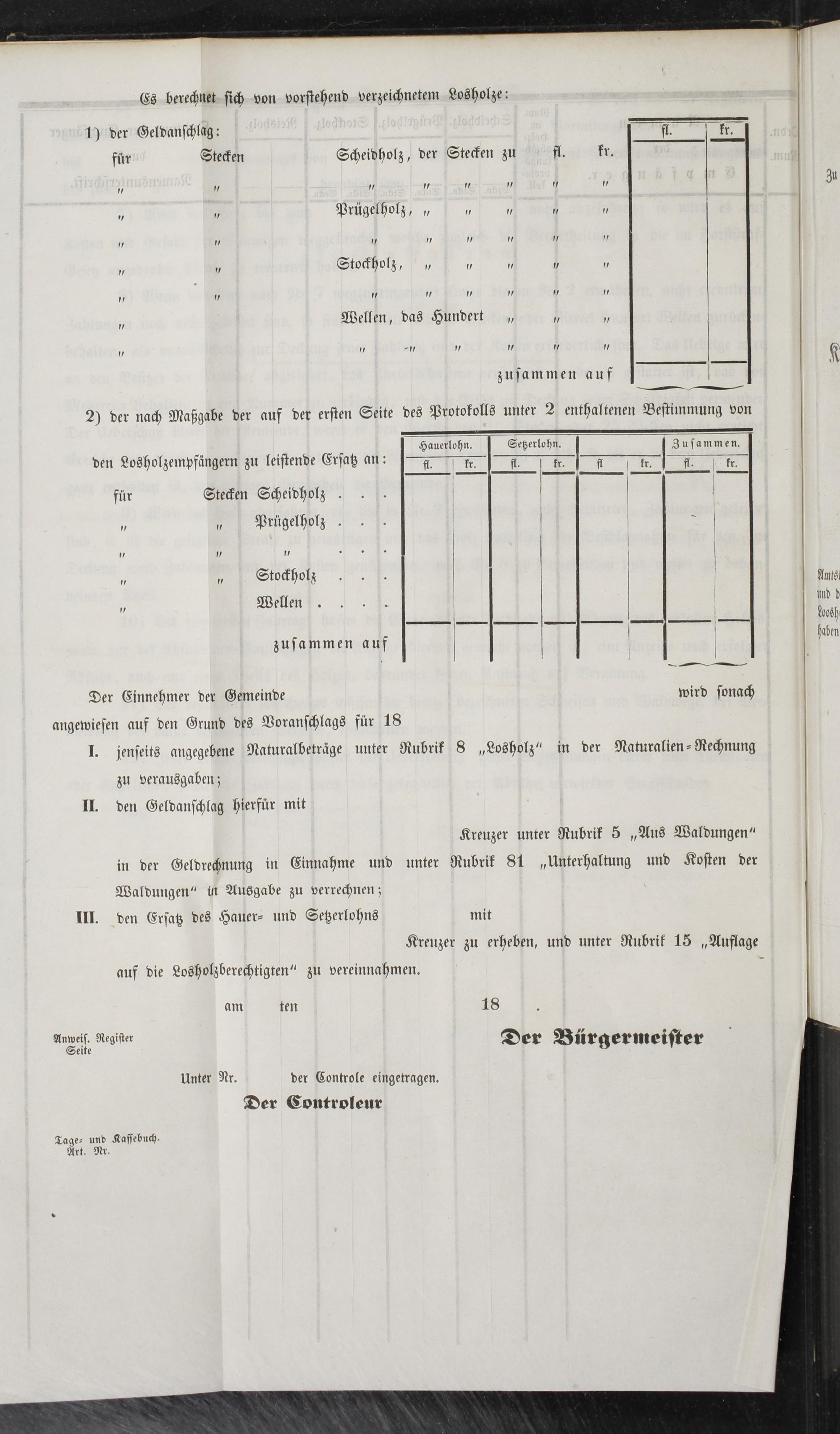 angewiesen auf den Grund des Voranschlags für 18 J. jenseits angegebene Naturalbeträge unter Rubrik 8„Losholz“ in der Naturalien-Rechnung zu verausgaben; II. den Geldanschlag hierfür mit Kreuzer unter Rubrik 5„Aus Waldungen“ in der Geldrechnung in Einnahme und unter Rubrik 81„unterhaltung und Kosten der Waldungen“ in Ausgabe zu verrechnen; III. den Ersatz des Hauer- und Setzerlohns mit Kreuzer zu erheben, und unter Rubrik 15„Auflage auf die Losholzberechtigten“ zu vereinnahmen. J