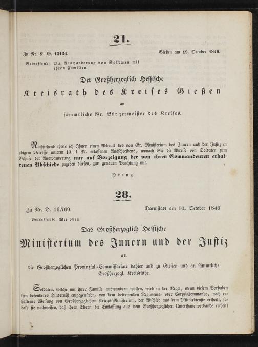 Nachstehend theile ich Ihnen einen Abdruck des von Gr. Ministerium des Innern und der Justiz in obigem Betreffe unterm 10. l. M. erlassenen Ausschreibens, wonach Sie die Abreise von Soldaten zum Behufe der Auswanderung nur auf Vorzeigung der von ihren Commandeuren erhal⸗ tenen Abschiede zugeben dürfen, zur genauen Beachtung mit. 8
