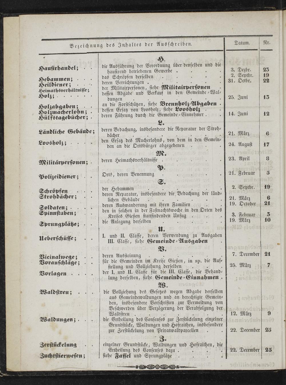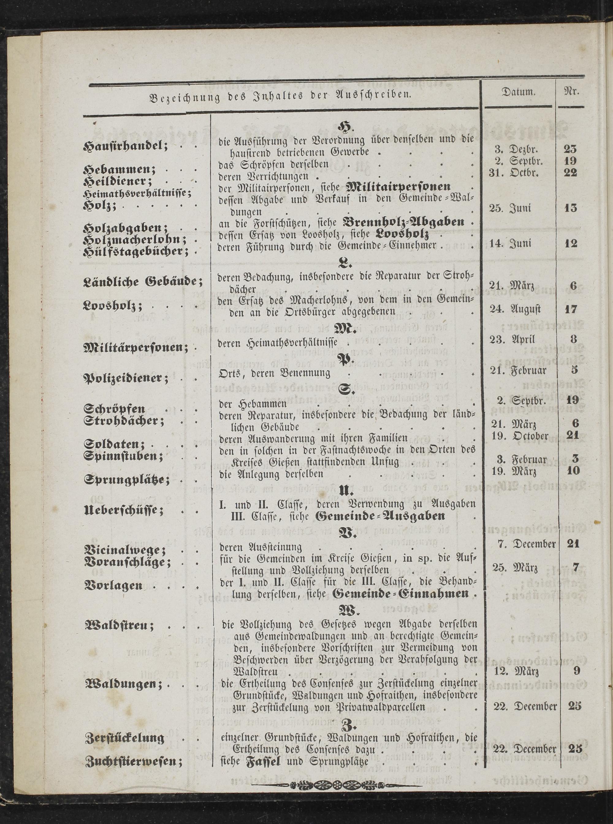 Bezeichnung des Inhaltes der Ausschreiben. Datum. Nr. si g die Ausführung der Verordnung über e und die Hausirhandelz haustrend betriebenen Gewerbe. 2 G0 45 g das Schröpfen derselben Septbr. All biener; deren Verrichtungen 60 1901 ö 31. Octbr. 22 der Militairpersonen, siehe Mili airper onen. „„ dessen Abgabe und Verkauf in den Gemeinde-Wal-⸗- i olz; dungen 5 5 5— 5 25. Juni 13 lan die Forstschützen, siehe rennholz⸗Abgaben eee dessen Ersatz von Loosholz, siehe Loos holz f Hulfstagebücher; deren Führung durch die Gemeinde-Einnehmer. 14. Juni 12 L. Indiz zd, deren Bedachung, insbesondere die Reparatur der Stroh— Ländliche Gebäude; 0 5 chung, 21. Min 1 2 den Ersatz des Macherlohns, von dem in den Gemein- Lobsholz; den an die Ortsbürger abgegebenen 24. August 17 M. Militärpersonen;. deren Heimathsverhältnisse. 23. April 8 P. Polizeidiener; Orts, deren Benennung. 5 2 5 21. Februar 5 S. der Hebammen 2. Septbr. 19 S8 8er. deren Reparatur, insbesondere die, Bedachung der länd⸗ 1 5 lichen Gebäude 21. März 6 Soldaten; deren Auswanderung mit ihren Familien 19. October 21 Spinnstuben; den in solchen in der Fastnachtswoche in den Orten des 8 Kreises Gießen stattfindenden Unfug 3. Februar 3 Sprungplätze; die Anlegung derselben 19. März 10 i u. lte: I. und II. Classe, deren Verwendung zu Ausgaben Wehe; III. Classe, siehe Gemeinde Ausgaben 5 7. December 21 Vieinalwege deren Aussteinung December Voranschlaͤge; für die Gemeinden im Kreise Gießen, in Sp. die Auf⸗ 5 stellung und Vollziehung derselben 1 25. März 7 Vorlagen... der I. und II. Classe für die III. Classe, die Behand⸗ ö lung derselben, siehe Gemeinde-Einnahmen W. Waldstreu; die Vollziehung des Gesetzes wegen Abgabe derselben aus Gemeindewaldungen und an berechtigte Gemein— den, insbesondere Vorschriften zur Vermeidung von Wee über Verzögerung der Verabfolgung der Waldstreu 12. März 9 Waldungen; die Ertheilung des Consenses zur Zerstückelung einzelner Grundstücke, Waldungen und Hofraithen, e zur Zerstückelung von Privatwaldparcellen 22. December 25 Zerstückelung einzelner Grundstücke, Waldungen und Hachen, die . Ertheilung des Consenses dazu 5 22. December 28 Zuchtstierwesen; siehe Fassel und Sprungplätze 0 8 5
