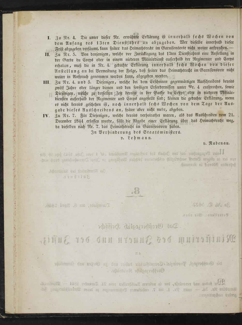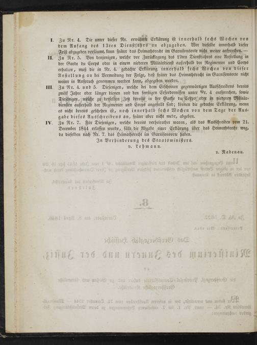 Zu Nr. 4. Die unter dieser Nr. erwähnte Erklärung ist innerhalb sechs Wochen von dem Anfang des 13ten Dienstjahrs an abzugeben. Wer dieselbe innerhalb dieser Frist abzugeben versäumt, kann später das Heimathsrecht im Garnisonsorte nicht weiter ansprechen.— Zu Nr. 5. Von denjenigen, welche vor Zurücklegung des 12ten Dienstjahres eine Anstellung in der Garde du Corps oder in einem niederen Militärdienst außerhalb der Regimenter und Corps erhalten, muß die in Nr. 4. gedachte Erklärung innerhalb sechs Wochen von dieser Anstellung an bei Vermeidung der Folge, daß später das Heimathsrecht im Garnisonsorte nicht weiter in Anspruch genommen werden kann, abgegeben werden. Zu Nr. 4. und 5. Diejenigen, welche bei dem Erscheinen gegenwärtigen Ausschreibens bereits zwölf Jahre oder länger dienen und den sonstigen Erfordernissen unter Pr. 4 entsprochen, sowie Diejenigen, welche zu derselben Zeit bereits in der Garde du Corps oder in niederen Militär⸗ diensten außerhalb der Regimenter und Corps angestellt si nd; können die gedachte Erklärung, wenn es nicht bereits geschehen ist, noch innerhalb sechs Wochen von dem Tage der Aus- gabe dieses Ausschreibens an, später aber nicht mehr, abgeben. Zu Nr. 7. Für Diejenigen, welche bereits verheirathet waren, als das Ausschreiben vom 21. December 1844 erlassen wurde, fällt die Abgabe einer Erklärung über das Heimathsrecht weg, da dieselben nach Nr. 7. das Heimathsrecht im Garnisonsorte haben.