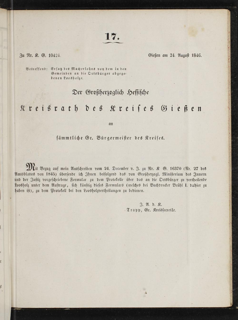 Zu Nr. K. G. 10424. Gießen am 24. August 1846.