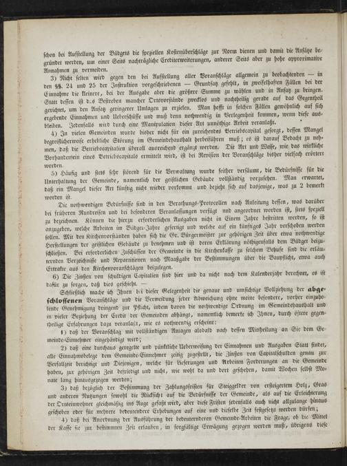 Schließlich mache ich Ihnen bei dieser Gelegenheit die genaue und umsichtige Vollziehung der abge⸗ schlossenen Voranschläͤge und die Vermeidung jeder Abweichung ohne meine besondere, vorher einzuho⸗ lende Genehmigung dringend zur Pflicht, indem davon die nothwendige Ordnung im Gemeindehaushalt und in vieler Beziehung der Credit der Gemeinden abhängt, namentlich bemerke ich Ihnen, durch öftere gegen— theilige Erfahrungen dazu veranlaßt, wie es nothwendig erscheint: