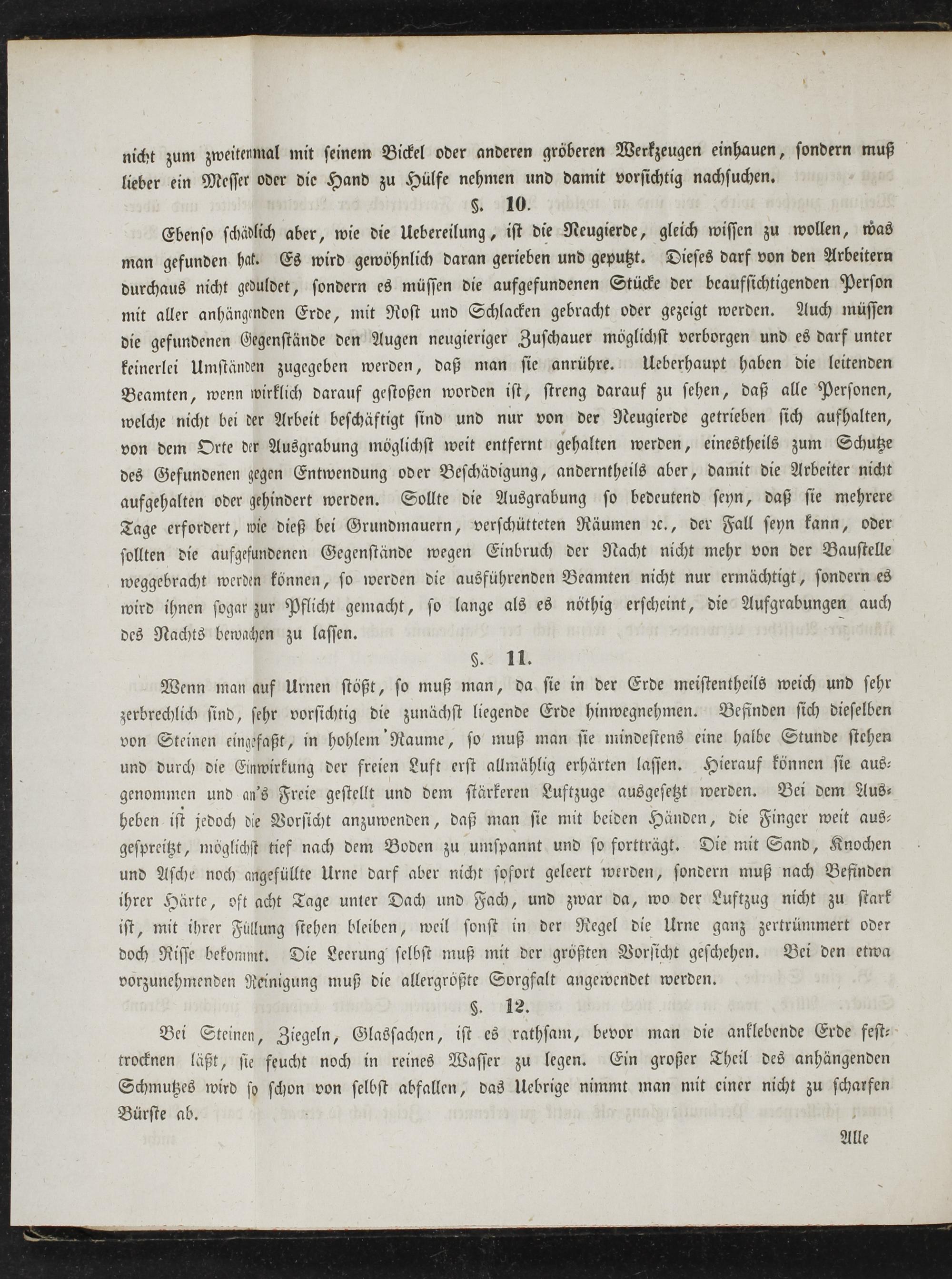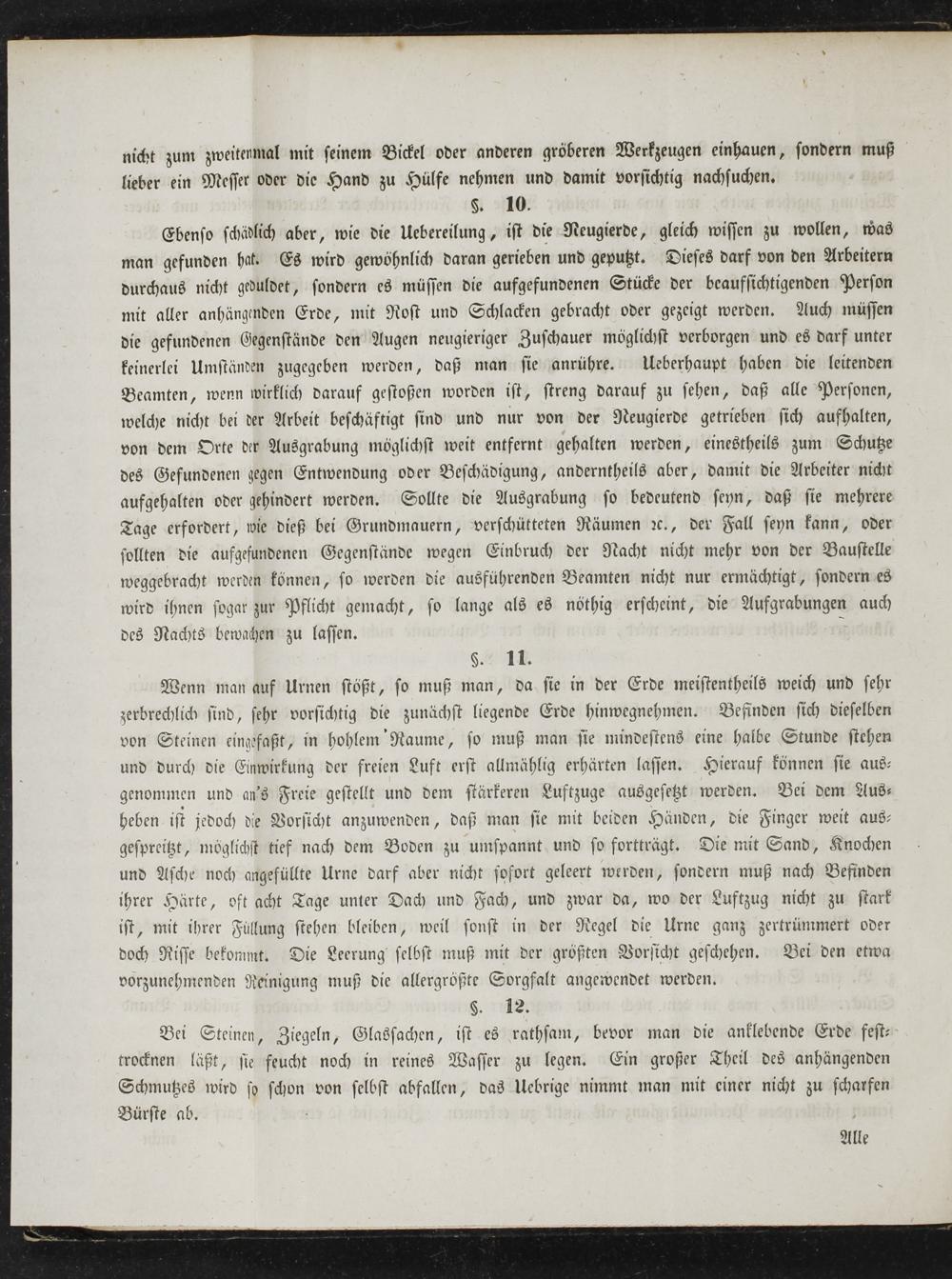 Ebenso schädlich aber, wie die Uebereilung, ist die Neugierde, gleich wissen zu wollen, was man gefunden hat. Es wird gewohnlich daran gerieben und geputzt. Dieses darf von den Arbeitern durchaus nicht geduldet, sondern es müssen die aufgefundenen Stücke der beaufsichtigenden Person mit aller anhängenden Erde, mit Rost und Schlacken gebracht oder gezeigt werden. Auch müssen die gefundenen Gegenstände den Augen neugieriger Zuschauer möglichst verborgen und es darf unter keinerlei Umständen zugegeben werden, daß man sie anrühre. Ueberhaupt haben die leitenden Beamten, wenn wirklich darauf gestoßen worden ist, streng darauf zu sehen, daß alle Personen, welche nicht bei der Arbeit beschäftigt sind und nur von der Neugierde getrieben sich aufhalten, von dem Orte der Ausgrabung möglichst weit entfernt gehalten werden, einestheils zum Schutze des Gefundenen gegen Entwendung oder Beschädigung, anderntheils aber, damit die Arbeiter nicht aufgehalten oder gehindert werden. Sollte die Ausgrabung so bedeutend seyn, daß sie mehrere Tage erfordert, wie dieß bei Grundmauern, verschütteten Räumen ꝛc., der Fall seyn kann, oder sollten die aufgefundenen Gegenstände wegen Einbruch der Nacht nicht mehr von der Baustelle weggebracht werden können, so werden die ausführenden Beamten nicht nur ermächtigt, sondern es wird ihnen sogar zur Pflicht gemacht, so lange als es nöthig erscheint, die Aufgrabungen auch des Nachts bewachen zu lassen. 5