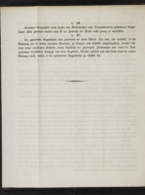 §. 16. Besondere Genauigkeit muß hierbei den Verhältnissen und Dimensionen der gefundenen Gegen⸗ stände selbst gewidmet werden und ist im Interesse der Sache nicht genug zu empfehlen. S e Die gefundenen Gegenstände sind zuvörderst an einen sicheren Ort und, wo möglich, in die Wohnung des die Arbeit leitenden Beamten, zu bringen und daselbst aufzubewahren, welcher als— dann seiner vorgesetzten Behörde, unter Anschluß der gefertigten Zeichnungen und eines die Aus— grabungen betreffenden Auszugs aus dem Tagebuch, Bericht erstattet und von dieser dann die nähere Weisung erhält, wohin er die gefundenen Gegenstände zu schicken hat.