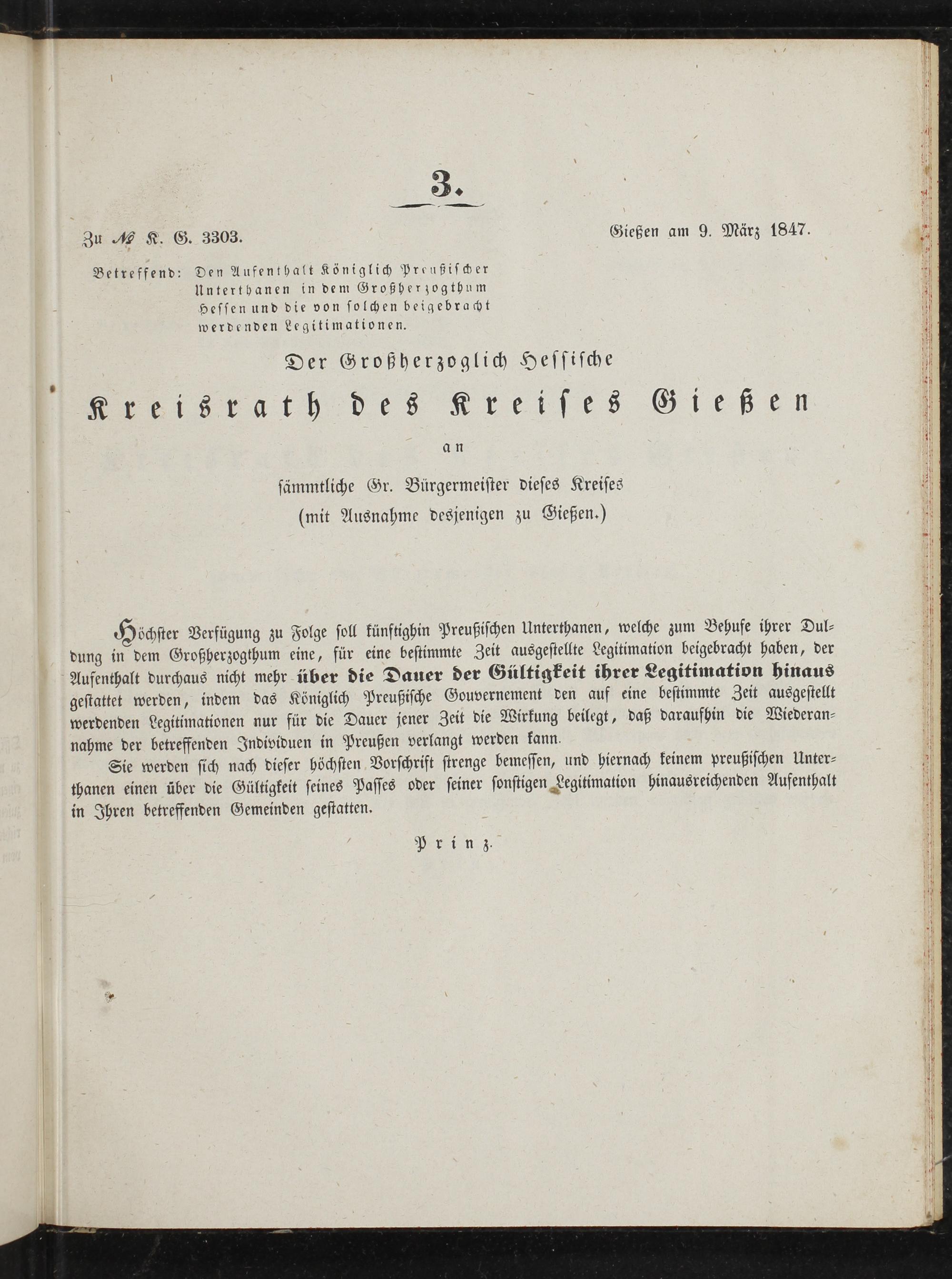 Zu A, K. G. 3303. Gießen am 9. März 1847.