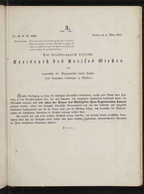 Betreffend: Den Aufenthalt Königlich Preußischer Unterthanen in dem Großherzogthum Hessen und die von solchen beigebracht werdenden Legitimationen.