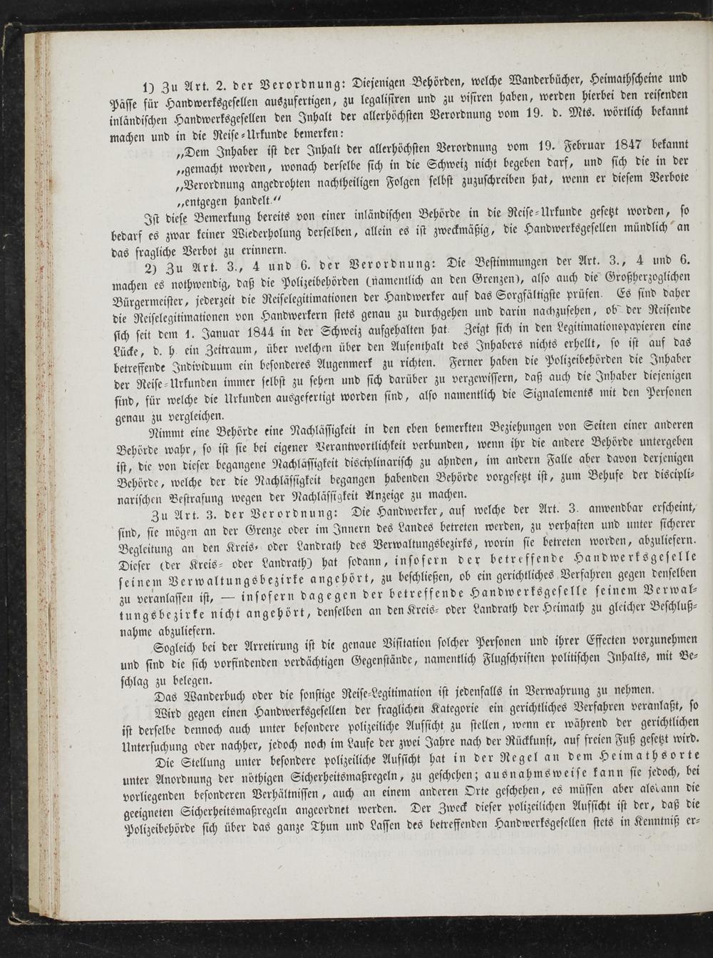 10 Zu Art. 2. der Verordnung: Diejenigen Behörden, welche Wanderbücher, Heimathscheine und Pässe für Handwerksgesellen auszufertigen, zu legalisiren und zu visiren haben, werden hierbei den reisenden inländischen Handwerksgesellen den Inhalt der allerhöchsten Verordnung vom 19. d. Mts. wörtlich bekannt machen und in die Reise⸗Urkunde bemerken: „Dem Inhaber ist der Inhalt der allerhöchsten Verordnung vom 19. Februar 1847 bekannt „gemacht worden, wonach derselbe sich in die Schweiz nicht begeben darf, und sich die in der „Verordnung angedrohten nachtheiligen Folgen selbst zuzuschreiben hat, wenn er diesem Verbote „entgegen handelt.“