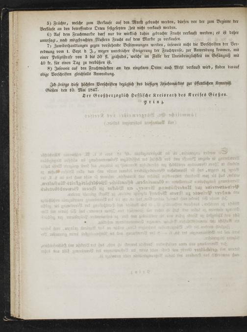 50 Ich bringe diese höchsten Vorschriften bezüglich des hiesigen Fruchtmarktes zur öffentlichen Kenntniß. Gießen den 10. Mai 1847. Der Großherzoglich Hessische Kreisrath des Kreises Gießen. Prinz.