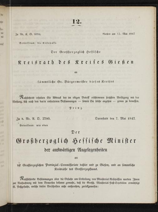 Zu Nr. K. G. 6094. Gießen am 63. Mai 1847 Betreffend: die Reisepässe.