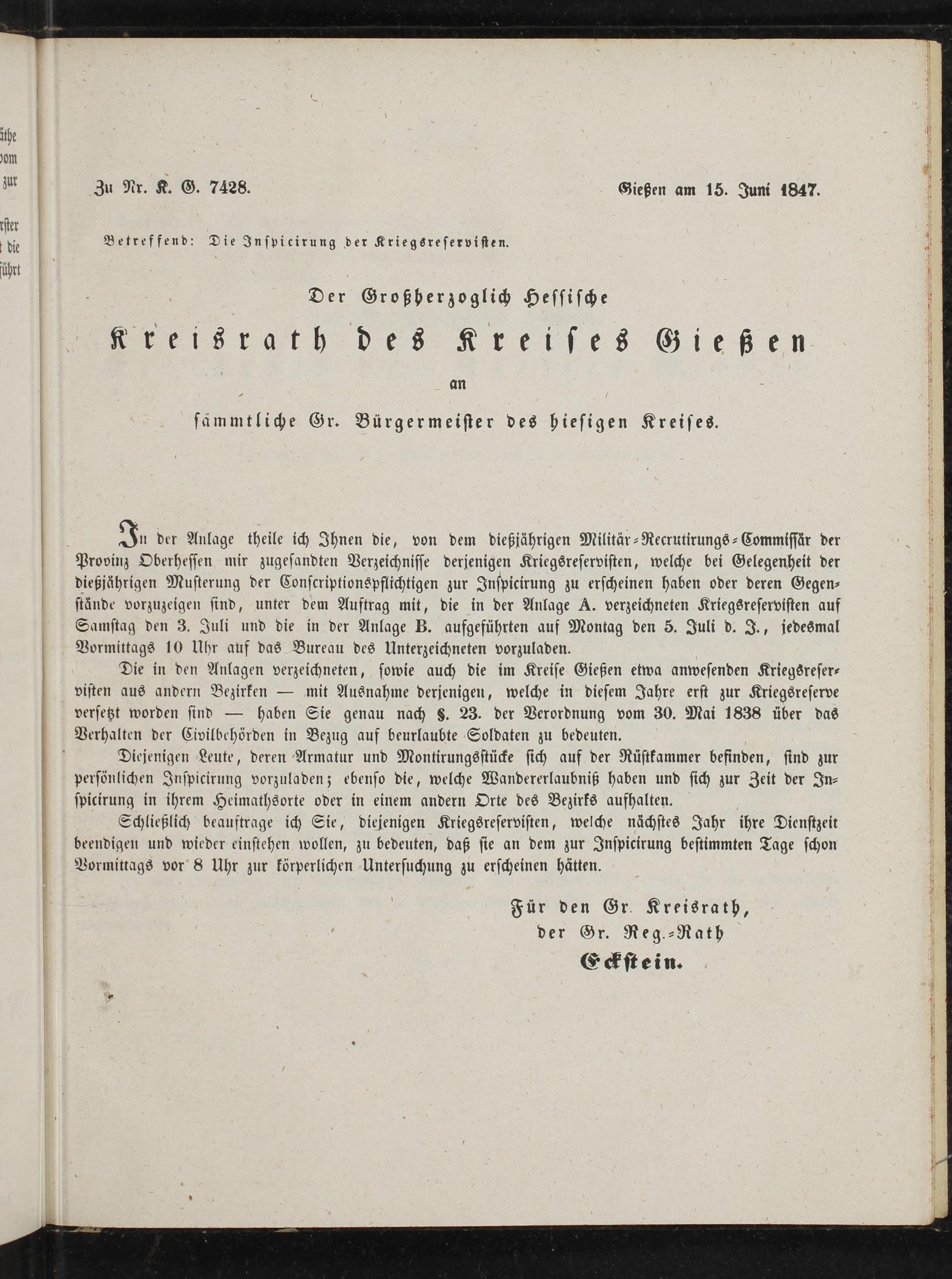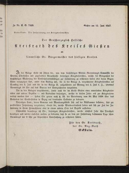 2 der Anlage theile ich Ihnen die, von dem dießjährigen Militär-Recrutirungs-Commissär der Provinz Oberhessen mir zugesandten Verzeichnisse derjenigen Kriegsreservisten, welche bei Gelegenheit der dießjñährigen Musterung der Conscriptionspflichtigen zur Inspicirung zu erscheinen haben oder deren Gegen— stände vorzuzeigen sind, unter dem Auftrag mit, die in der Anlage A. verzeichneten Kriegsreservisten auf Samstag den 3. Juli und die in der Anlage B. aufgeführten auf Montag den 5. Juli d. J., jedesmal Vormittags 10 Uhr auf das Bureau des Unterzeichneten vorzuladen.