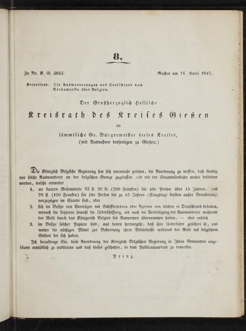 Betreffend: Die Auswanderungen aus Deutschland nach Nordamerika über Belgien.