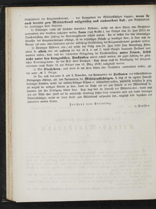 2) Denjenigen(nicht als Einsteher dienenden) Soldaten, welche mit ihren Eltern oder Großeltern auswandern oder denselben nachziehen wollen, kann(nach Artikel 1. des Gesetzes vom 21. Juni 1833) die Dienstentlassung ohne Zahlung der Vertretungssumme ertheilt werden. Da es mithin von dem jedesmaligen Ermessen des Kriegsministeriums abhängt, ob die deßfallsigen Gesuche zu bewilligen seien, so kann nicht im Voraus und unter allen Umständen auf eine willsährige Entschließung des Kriegsministeriums gerechnet werden.